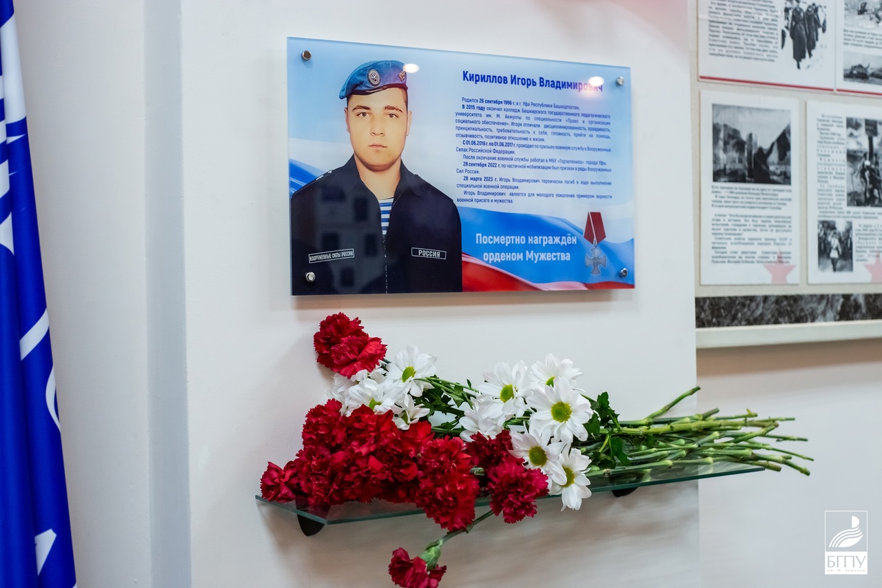 Накануне Дня Великой Победы в Музее 214-ой Кременчугско – Александрийской краснознаменной орденов Суворова и Богдана   Хмельницкого стрелковой дивизии в 7 корпусе БГПУ имени Акмуллы собрались студенты, преподаватели университета, Колледжа Акмуллинского университета, чтобы вспомнить Игоря Владимировича Кирилловича, выпускника колледжа, отдавшего свою жизнь на СВО и за героизм посмертно награжденного Орденом Мужества.