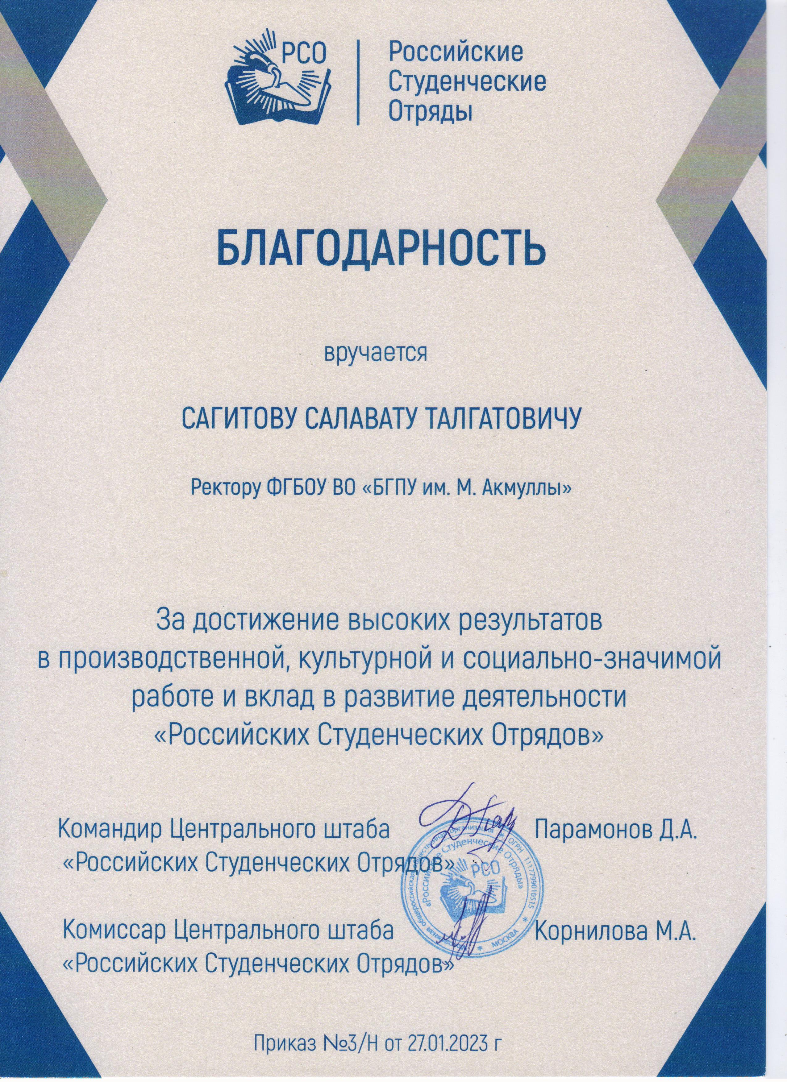 Активное участие студентов Башгоспедуниверситета в движении студенческих отрядов получает поддержку со стороны руководства Центрального штаба РСО. В адрес ректора вуза Салавата Сагитова поступило благодарственное письмо от командира Центрального штаба РСО Дмитрия Парамонова и комиссара Центрального штаба РСО Марии Корниловой. В нем руководители штаба российских студотрядов выражают благодарность за достижение высоких результатов в производственной, культурной и социально-значимой работе и вклад в развитие деятельности Российских студенческих отрядов.