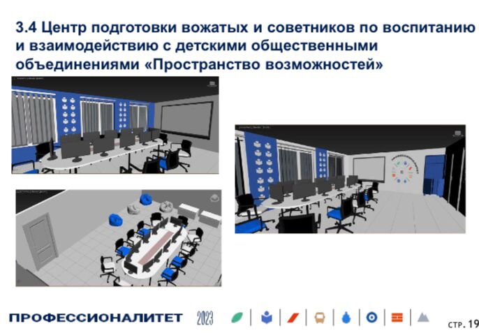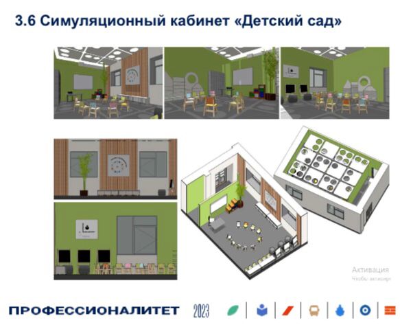В центре запланировано оборудование зон для различных направлений, по которым будет вестись подготовка специалистов в отрасли «Педагогика». Федеральный проект «Профессионалитет» дает возможность сделать обучение максимально практико-ориентированным, чтобы студент смог полноценно изучить весь профессиональный цикл, получить навыки и практический опыт в опоре на серьезный компетентностный каркас. Это учитывается и при подготовке  и оборудовании помещений для учебы.