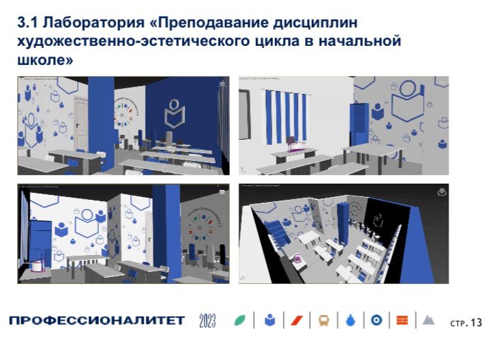 Лаборатория «Преподавание дисциплин художественно-эстетического цикла в начальной школе» рассчитана на 17 рабочих мест, предназначенных для отработки студентами навыков преподавания изобразительного искусства и черчения при помощи современных программно-технических средств. Здесь студенты будут работать с фотоаппаратом в мультистудии, набором для рисования на песке и на воде. Дополнительным удобством для работы станет портативная переносная мультистудия с мультистанко и осветительными  приборами  .