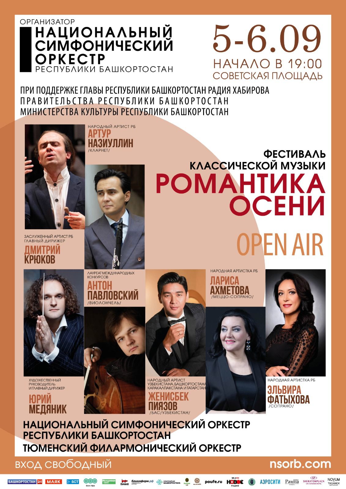 5 сентября для жителей Уфы и гостей столицы выступит Национальный симфонический оркестр Республики Башкортостан под управлением заслуженного артиста РБ, лауреата Государственной премии имени Салавата Юлаева маэстро Дмитрия  Крюкова. Солисты – народный артист РБ Артур Назиуллин (кларнет), народный артист Узбекистана, Башкортостана, Каракалпакстана и Татарстана Женисбек Пиязов (бас), народные артистки РБ Лариса Ахметова (сопрано) и Эльвира Фатыхова (сопрано).