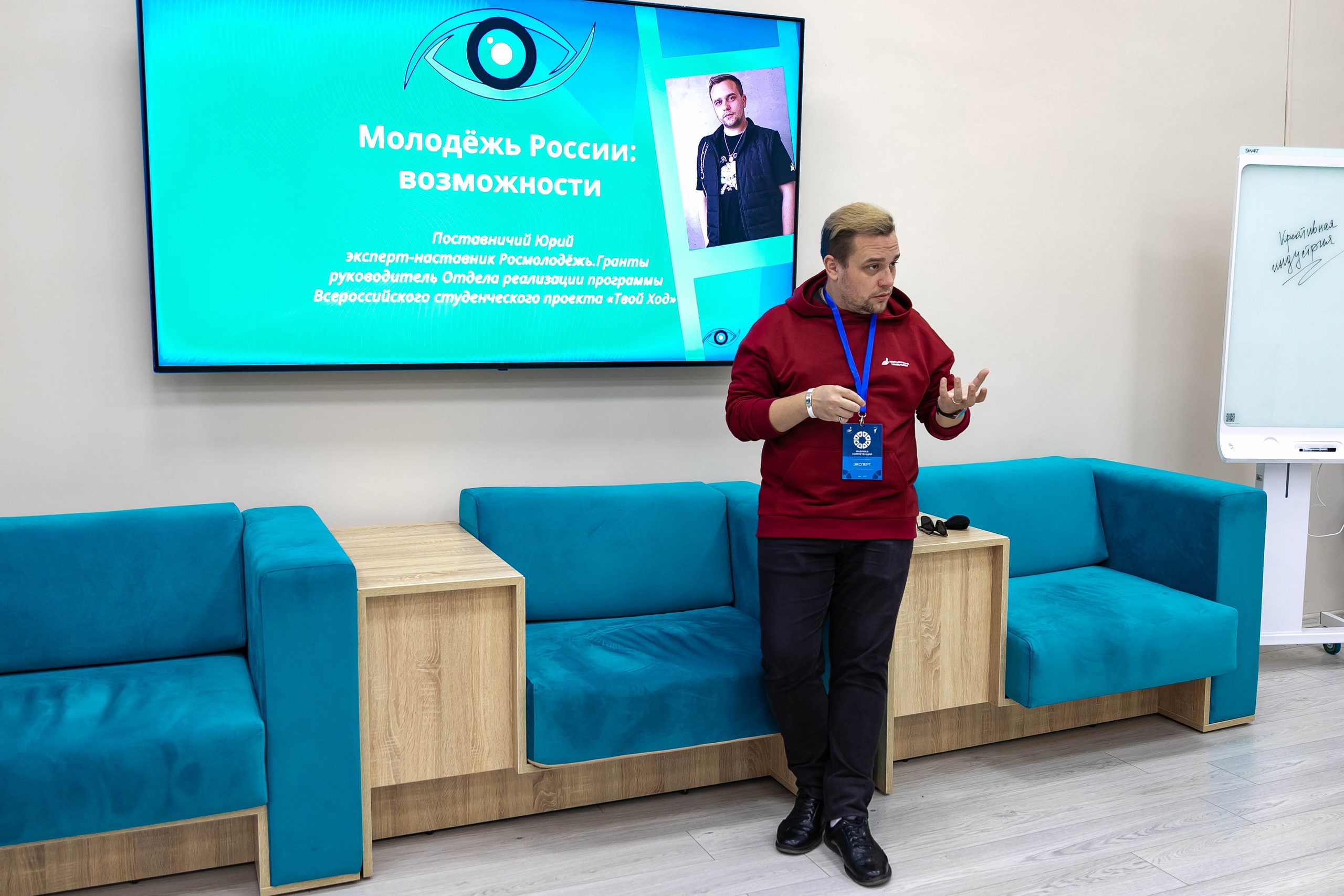 На дискуссионной встрече «Территория твоих возможностей» с председателями студенческих советов и руководители проектных офисов пообщался Юрий Поставничий, руководитель конкурсного направления Всероссийского студенческого конкурса «Твой Ход», эксперт-наставник «Росмолодежь.Гранты».