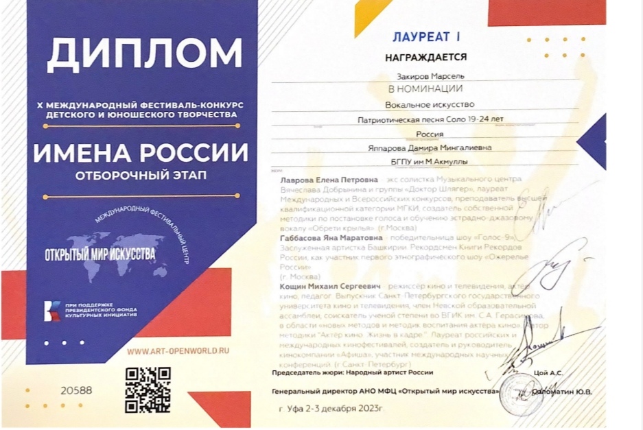 Студент Марсель Закиров стал лауреатом 1 степени фестиваля «Имена России»