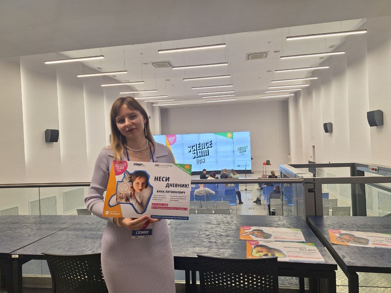 В формате увлекательных 10-минутных выступлений исследователи рассказали о своих работах, делая сложные научные темы доступными и интересными широкой аудитории, выступая популяризаторами науки. Тема выступления студентки Акмуллинского: «Неси дневник!».  Анна предложила взглянуть на процесс оценивания глазами педагога, раскрывая проблемы и дилеммы, с которыми сталкиваются учителя при выставлении оценок.