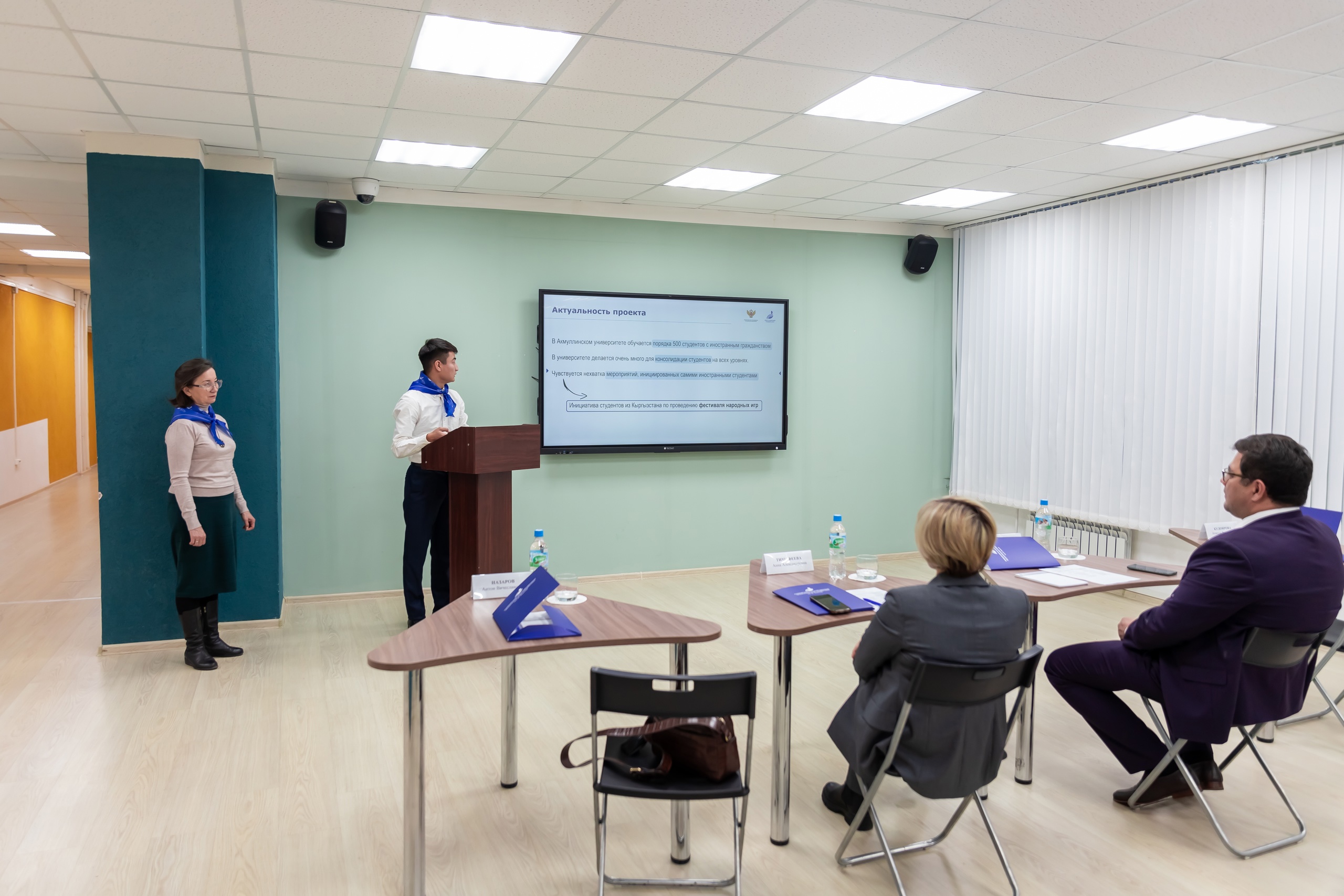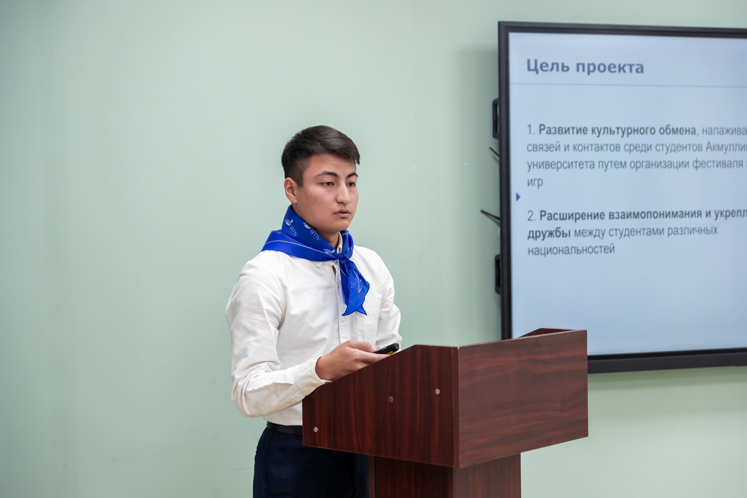 Туратбек Назаркулов, студент 3 курса ФБФ из Киргизии, презентовал фестиваль народных игр «Этноигротека». В Акмуллинском университете такой праздник прошел в октябре 2024 года и позволил студентам не только познакомиться с культурой и традициями разных стран, найти в них схожие черты, но и подружиться. Салават Талгатович подчеркнул, что авторами и организаторами были студенты вуза из Киргизии, которые представили игротеку на вузовском Акселераторе проектов и получили поддержку руководства. Туратбек отметил, что проект может быть адаптирован к проведению в разных регионах России и успешно реализовываться в педагогических вузах страны.