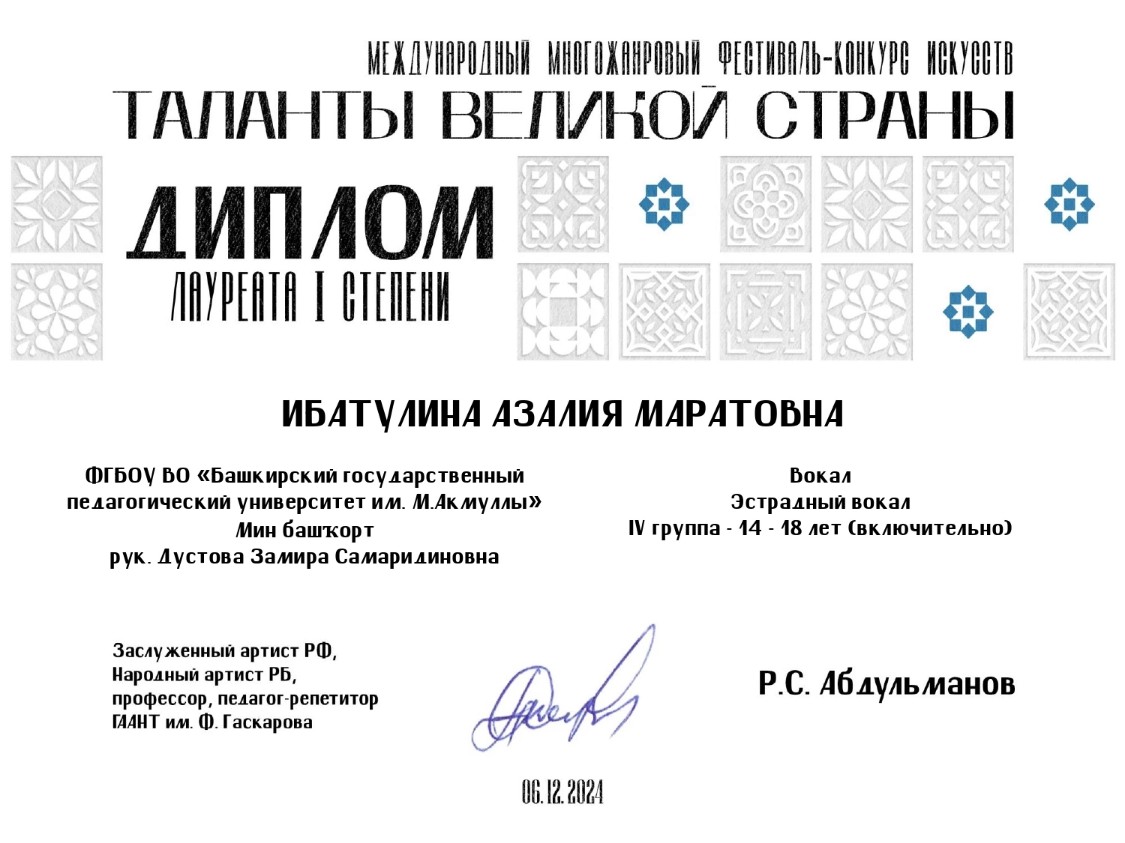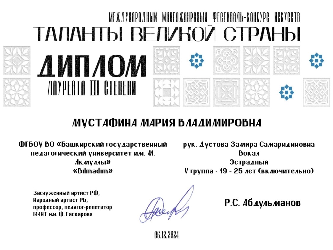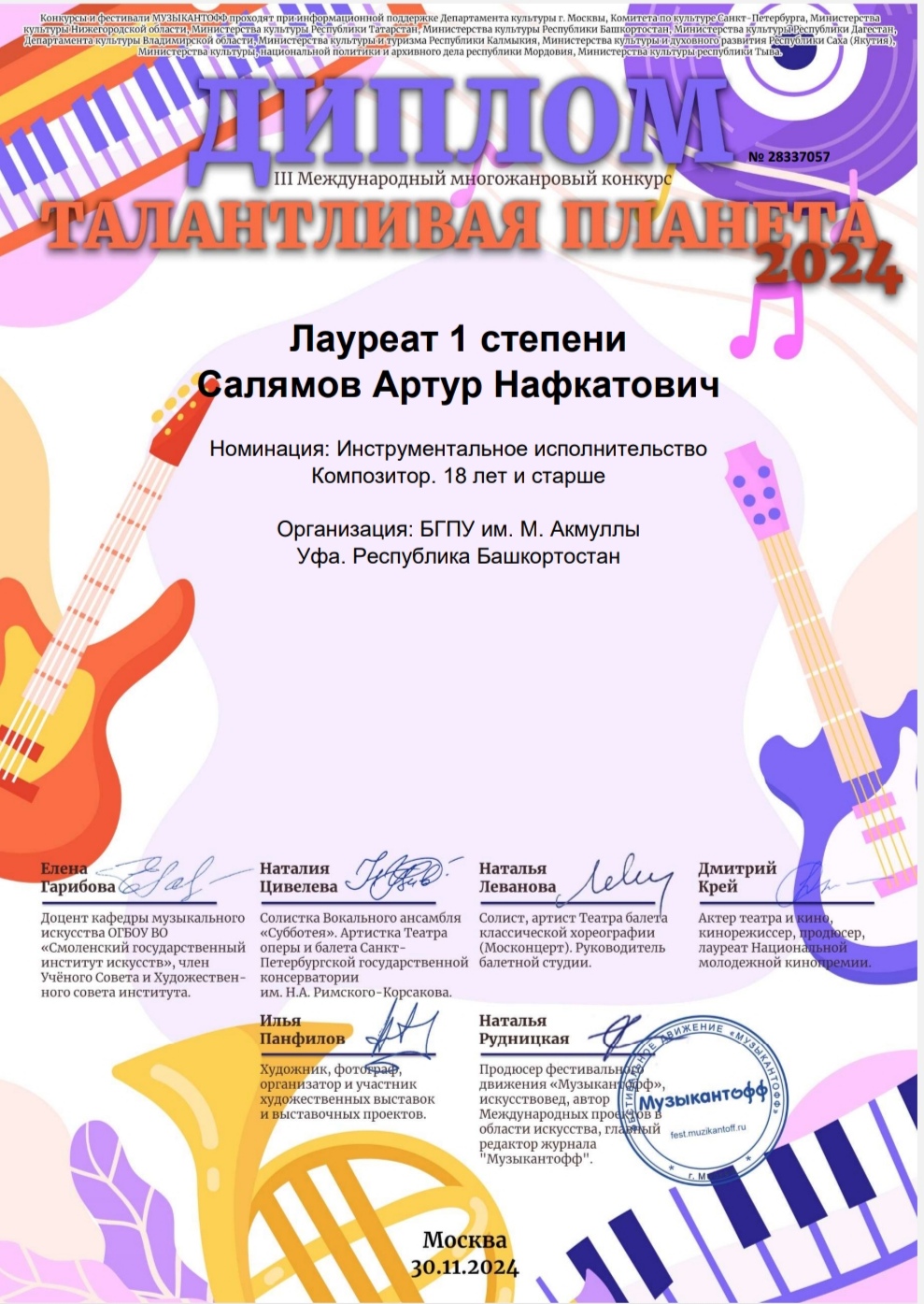 Магистрант Артур Салямов, руководитель оркестра Культурного центра Министерства внутренних дел по Республике Башкортостан стал лауреатом I степени Международного многожанрового конкурса «Талантливая планета». Он победил  в номинации «Инструментальное исполнительство. Композитор». Руководителем выступила профессор кафедры Ирма Тагариева.