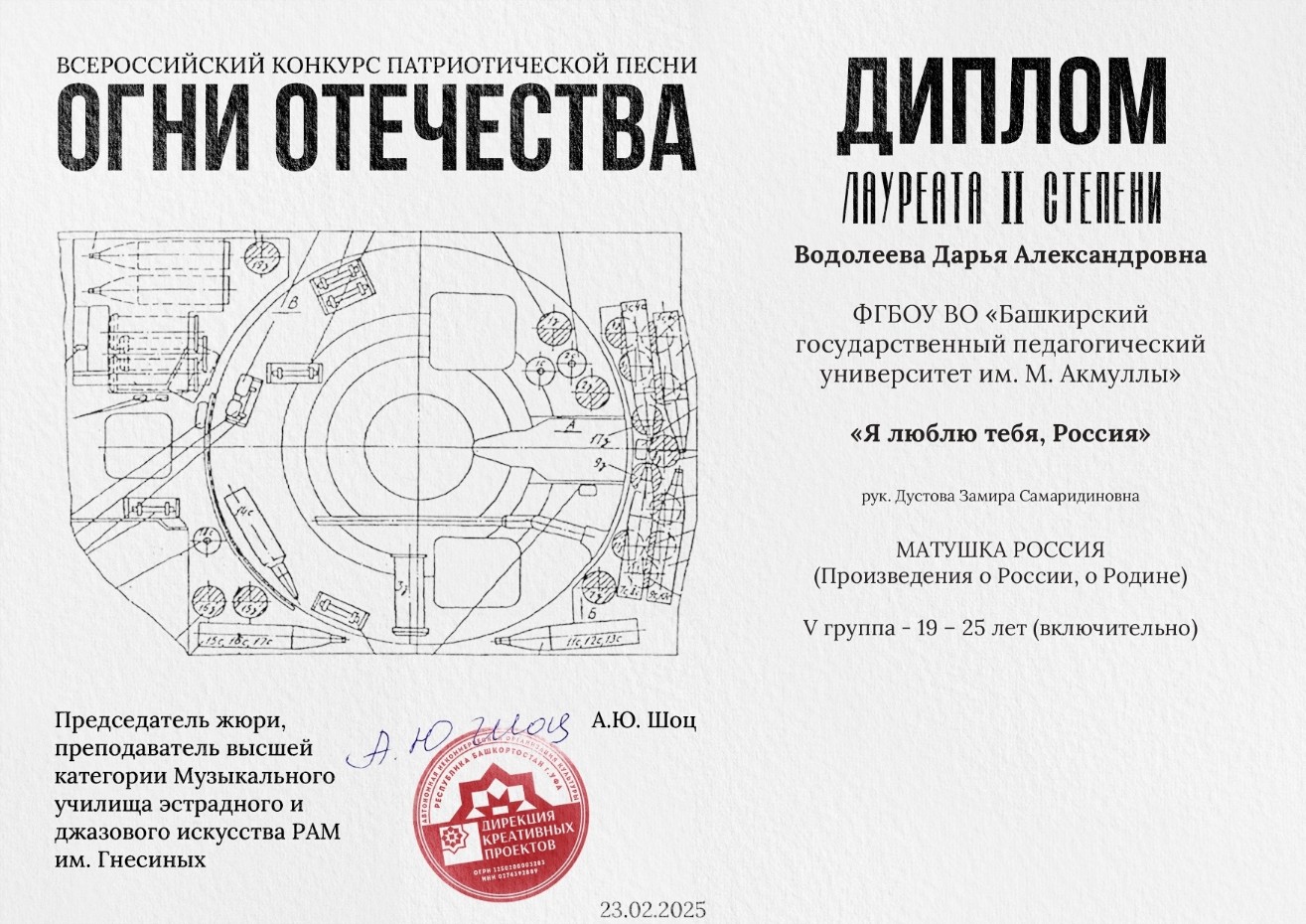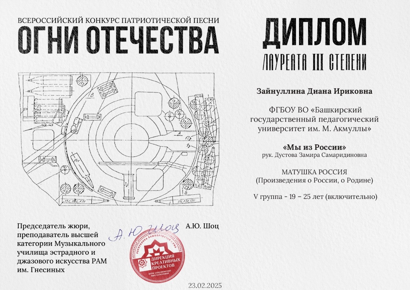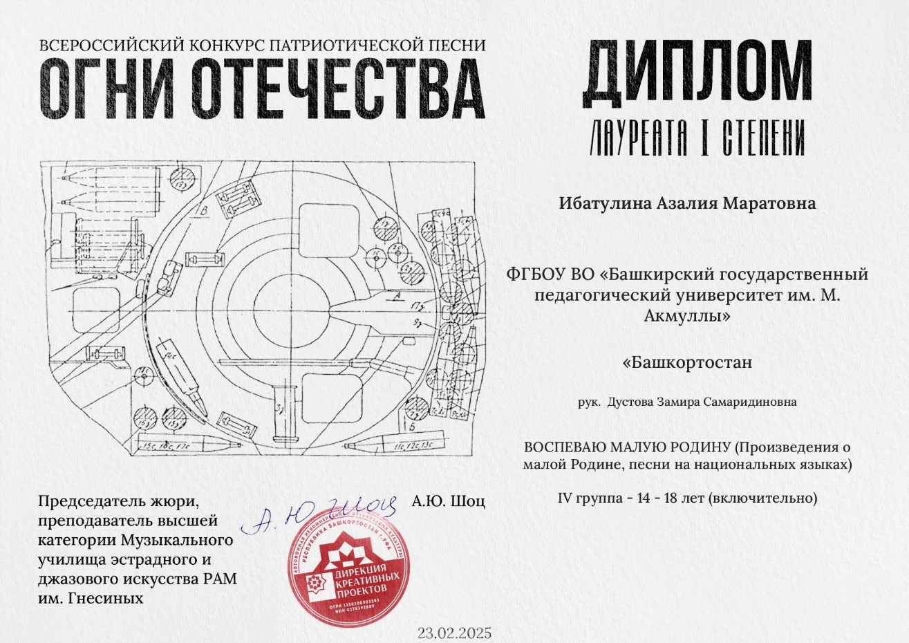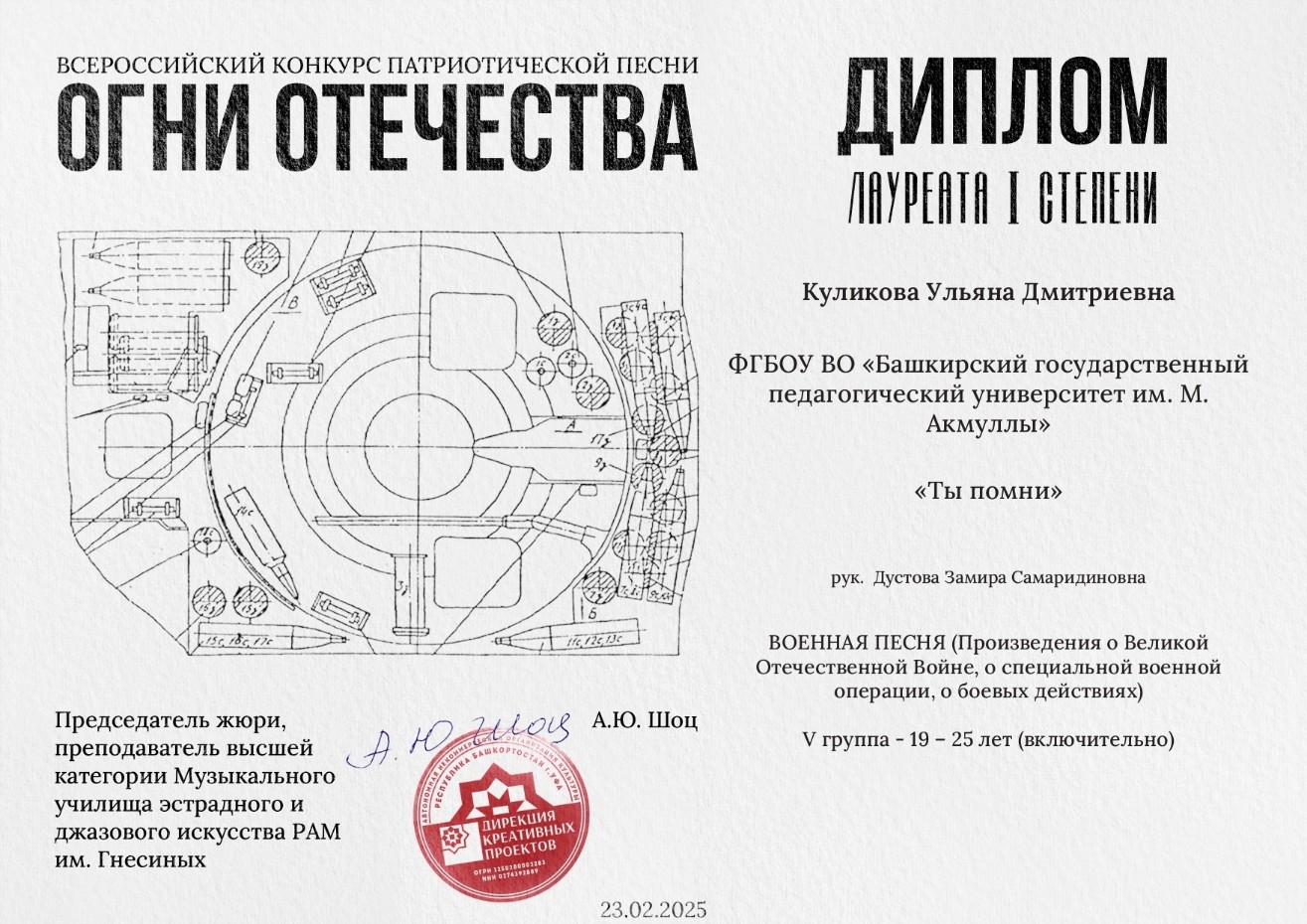 В конце февраля в Уфе были подведены итоги Всероссийского конкурса патриотической песни «Огни Отечества», в котором приняли участие свыше 400 участников со всей страны. Конкурс проводился в целях патриотического воспитания детей, молодежи, популяризации искусства в исполнительском и педагогическом аспектах, открытия новых имен и талантов в области искусств.