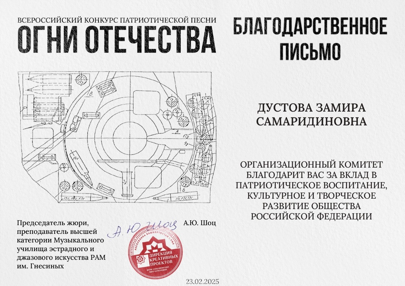 Педагог - доцент Замира Дустова была награждена благодарственным письмом за вклад в патриотическое воспитание, культурное и творческое развитие общества Российской Федерации.