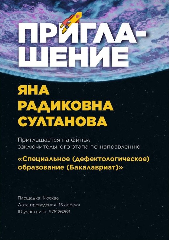 Яна прошла отборочный этап и выполнила задания полуфинала. Полуфинал заключительного этапа проходил в онлайн формате и предполагал решение задания по разработке программы коррекционно-развивающей работы с ребенком с ОВЗ. Грамотное решение кейсового задания продемонстрировало готовность участника к основным видам будущей профессиональной деятельности (диагностической, консультативной, коррекционно-развивающей, просветительской) в реальной педагогической практике.