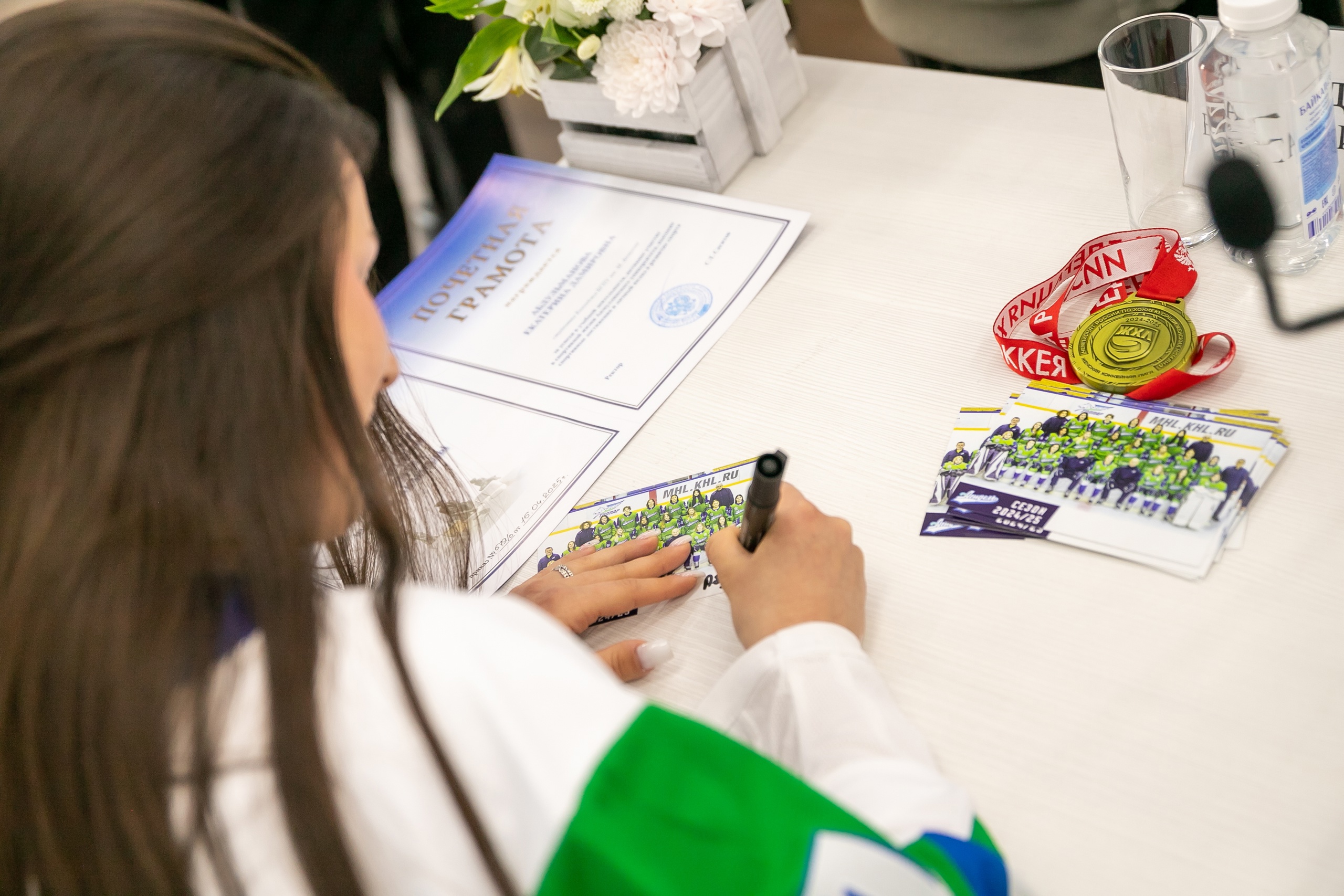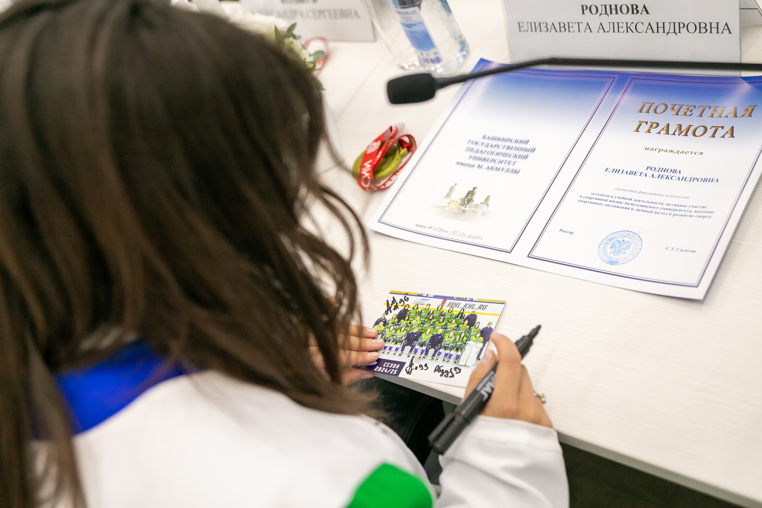 Девушки передали в подарок университету форменный свитер с автографами участниц команды. Завершилась встреча автограф-сессией и фотографированием на память.