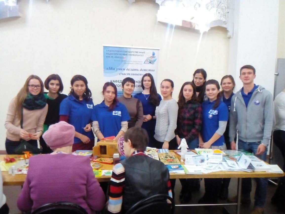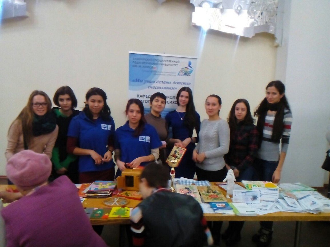 5 декабря 2016 г. Институт семьи и детства БГПУ им. М. Акмуллы (под руководством директора Института педагогики, профессора Исламовой З.И. и доц. Хайртдиновой Л.Ф.) провел благотворительное мероприятие, посвященное Международному Дню инвалида в Городском дворце культуры г. Уфы. Организаторами мероприятия выступили: Уфимская городская Организация инвалидов «МИР», Институт семьи и детства БГПУ им. М. Акмуллы. Цель мероприятия: организация досуга инвалидов, привлечение внимания общественности к проблемам инвалидов, знакомство с творчеством и произведениями народного промысла людей с инвалидностью, презентация социально-образовательных и оздоровительных услуг, предоставляемых Институтом семьи и детства БГПУ им. Акмуллы для людей с ограниченными возможностями здоровья и их семьям. Студенты 1, 2 курсов ППО ДО и преподавательский состав кафедры дошкольной педагогики и психологии Института педагогики (зав.каф., к.п.н., доц. Боронилова И.Г., к.п.н., доц. Шабаева Г.Ф., ст. преп. Валеева Л.Ю.), а так же заведующая МАДОУ № 162, супервизор-консультант, магистр психолого-gедагогического образования Танюкевич А.В. приняли активное участие в работе интерактивных площадок.