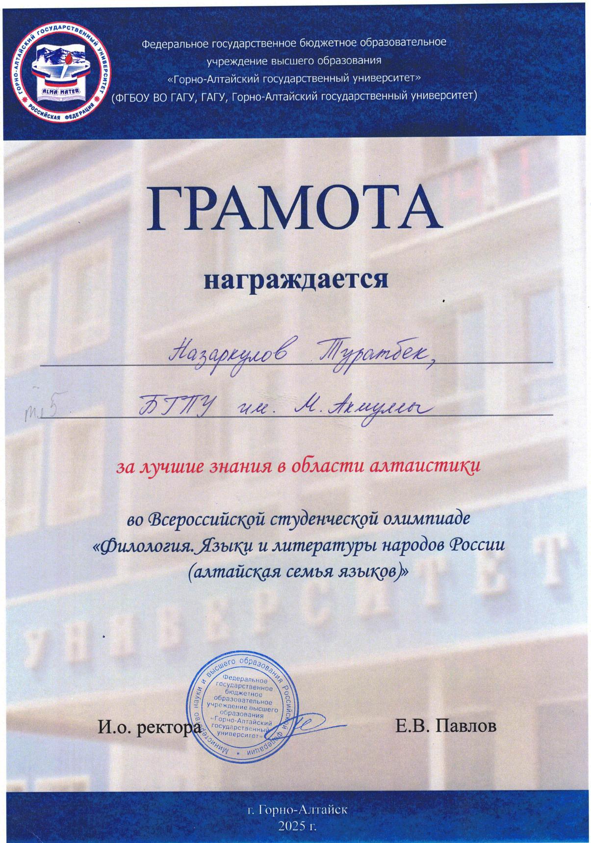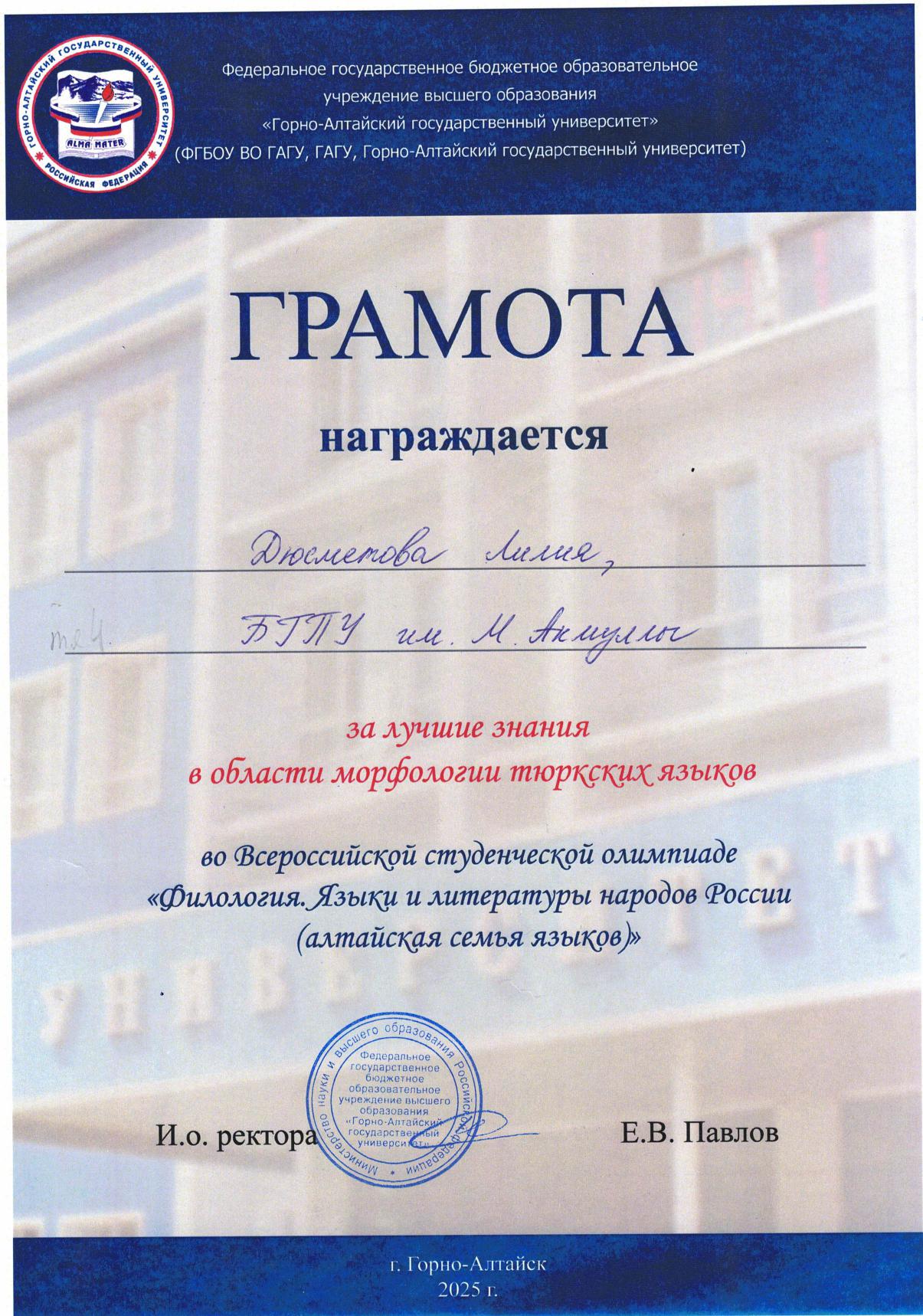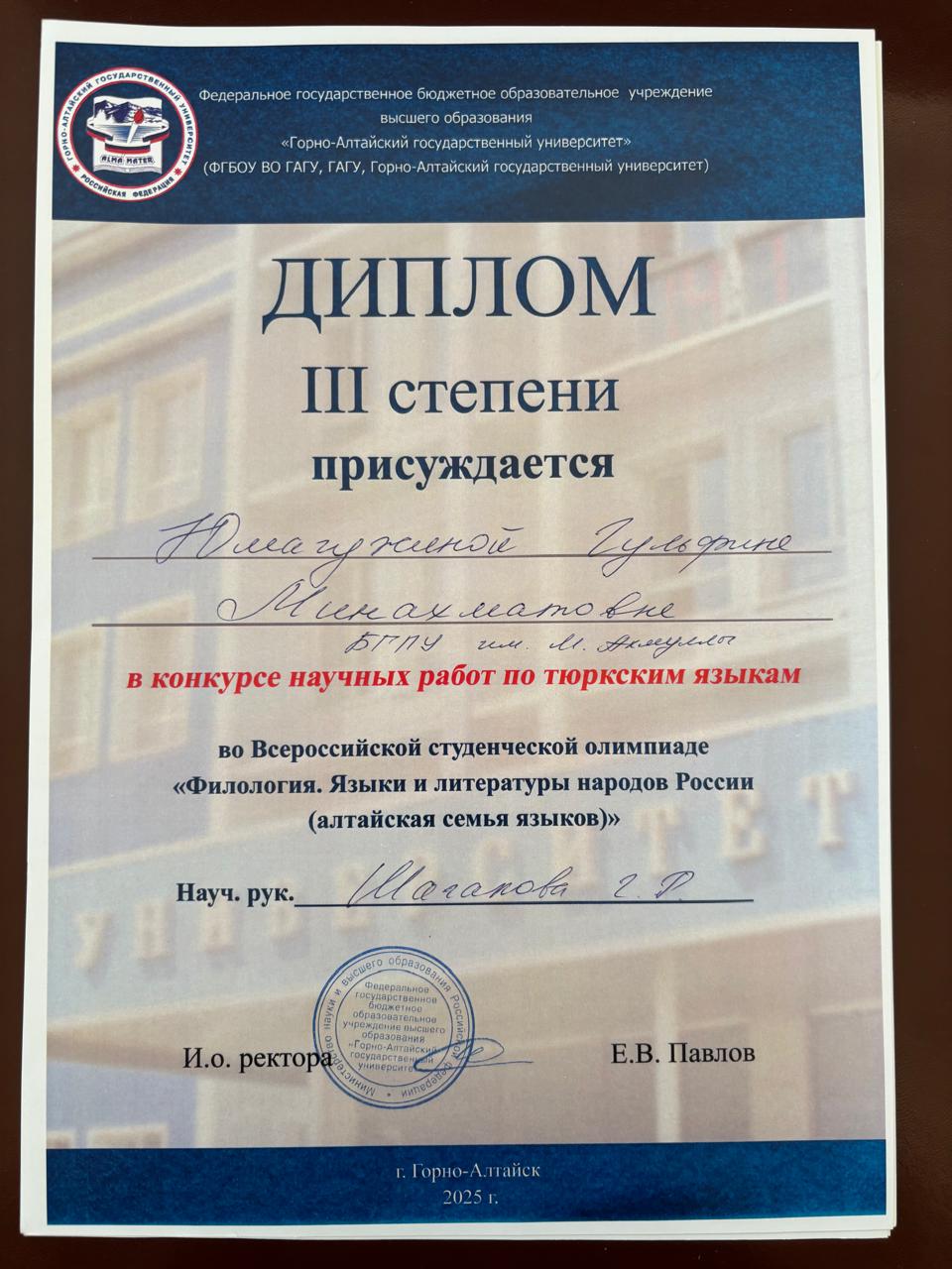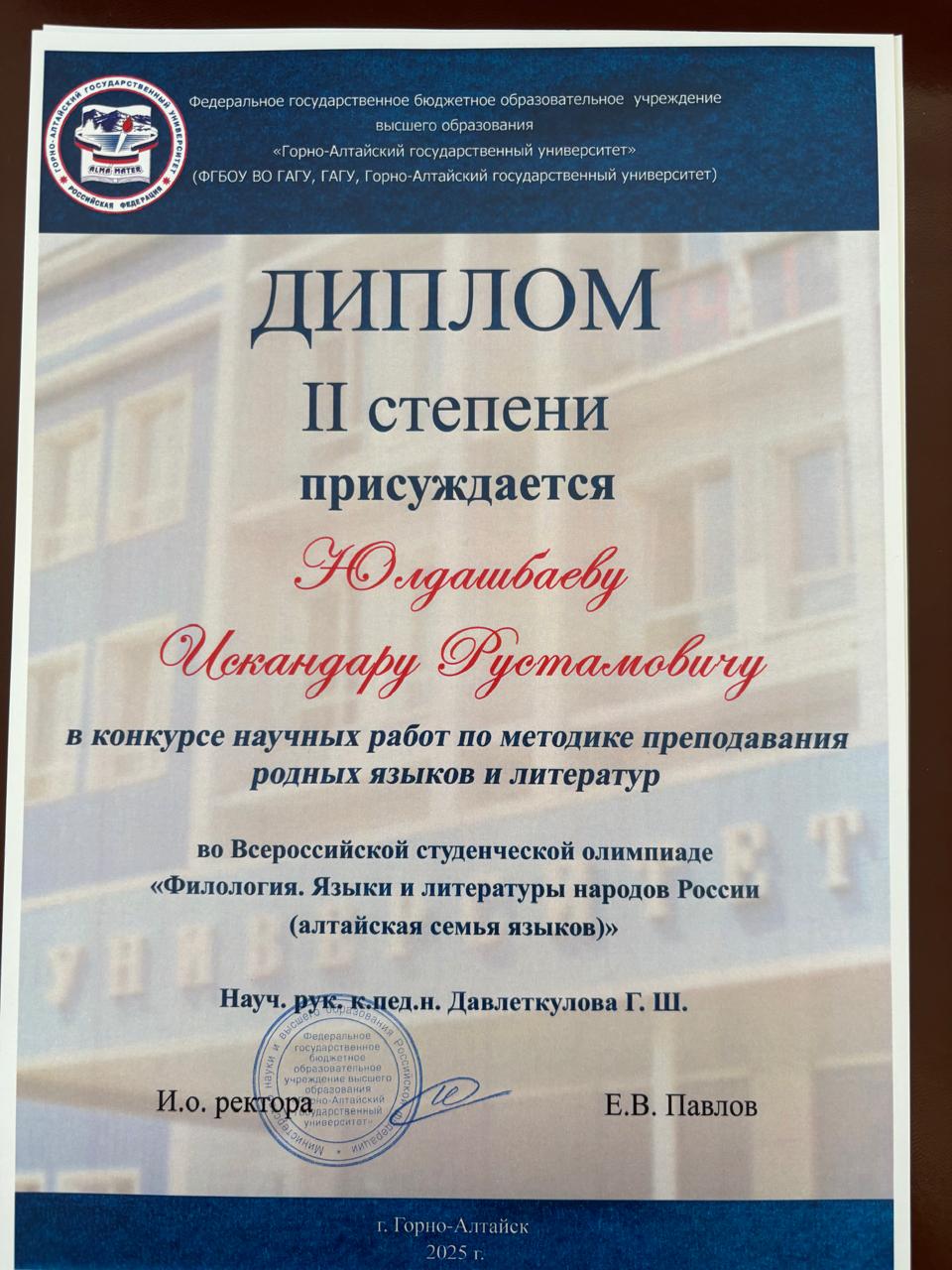С 11 по 18 мая 2025 года в Республике Алтай на базе Горно-Алтайского государственного университета прошла Всероссийская студенческая олимпиада «Филология. Языки и литературы народов Российской Федерации (тюркская группа)». Участниками олимпиады стали команды из Башкортостана, Якутии, Хакасии, Тувы и Алтая.