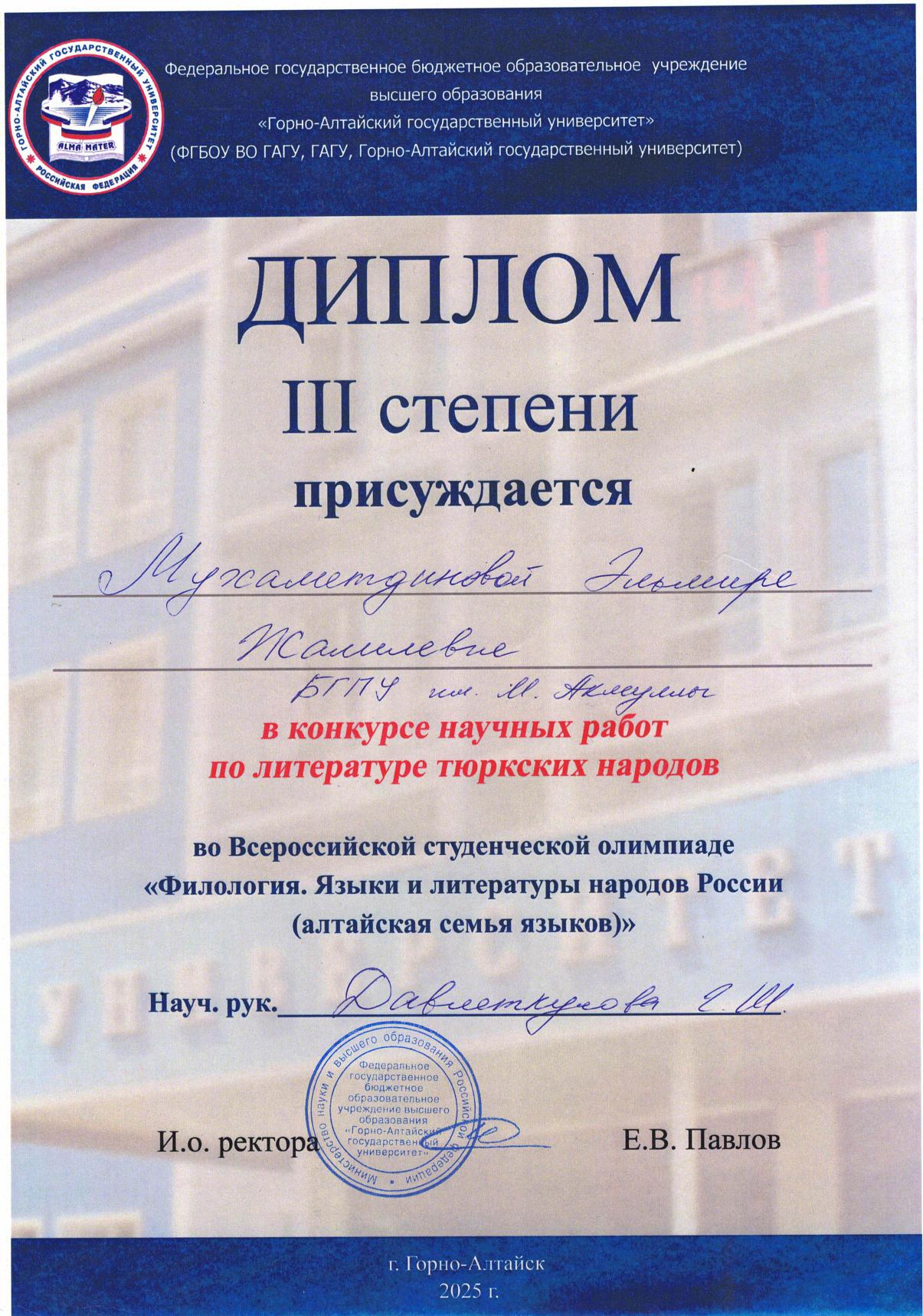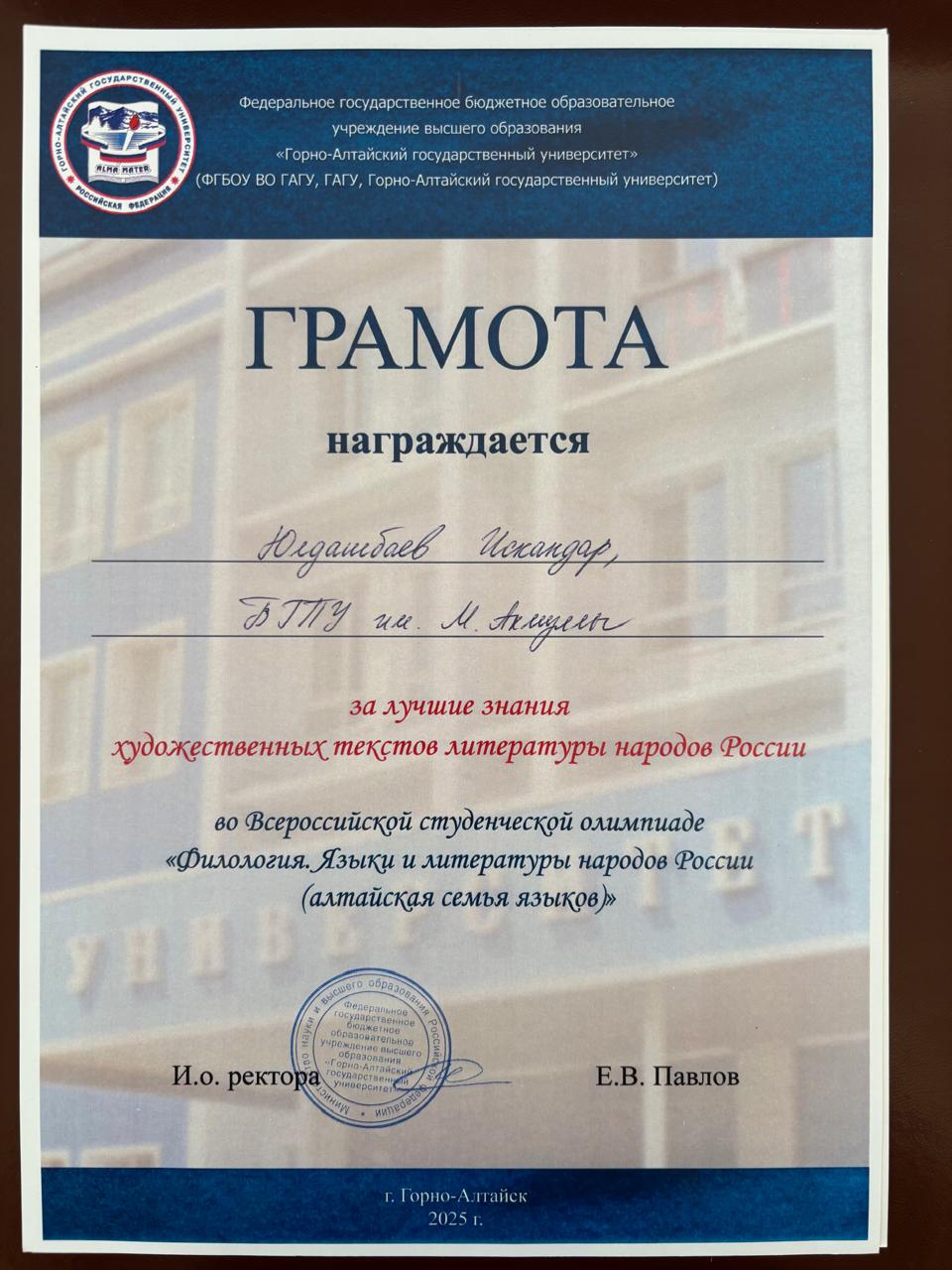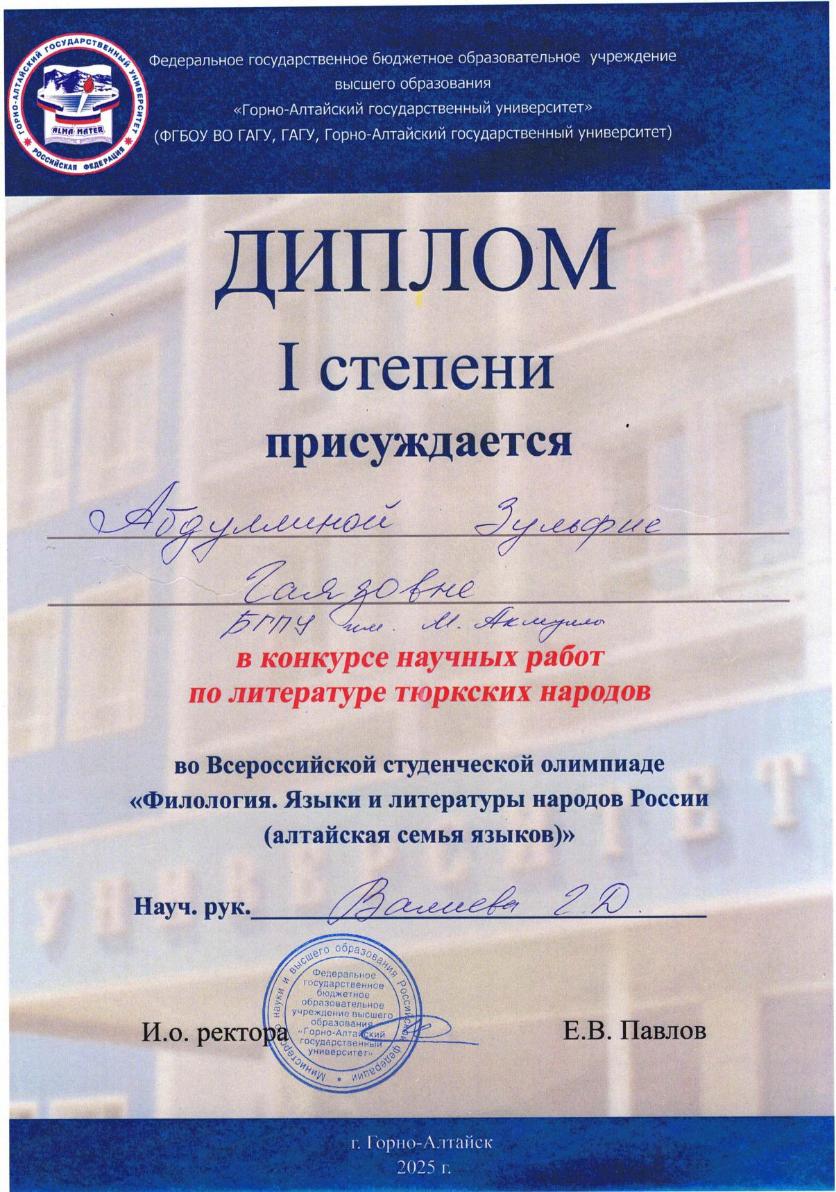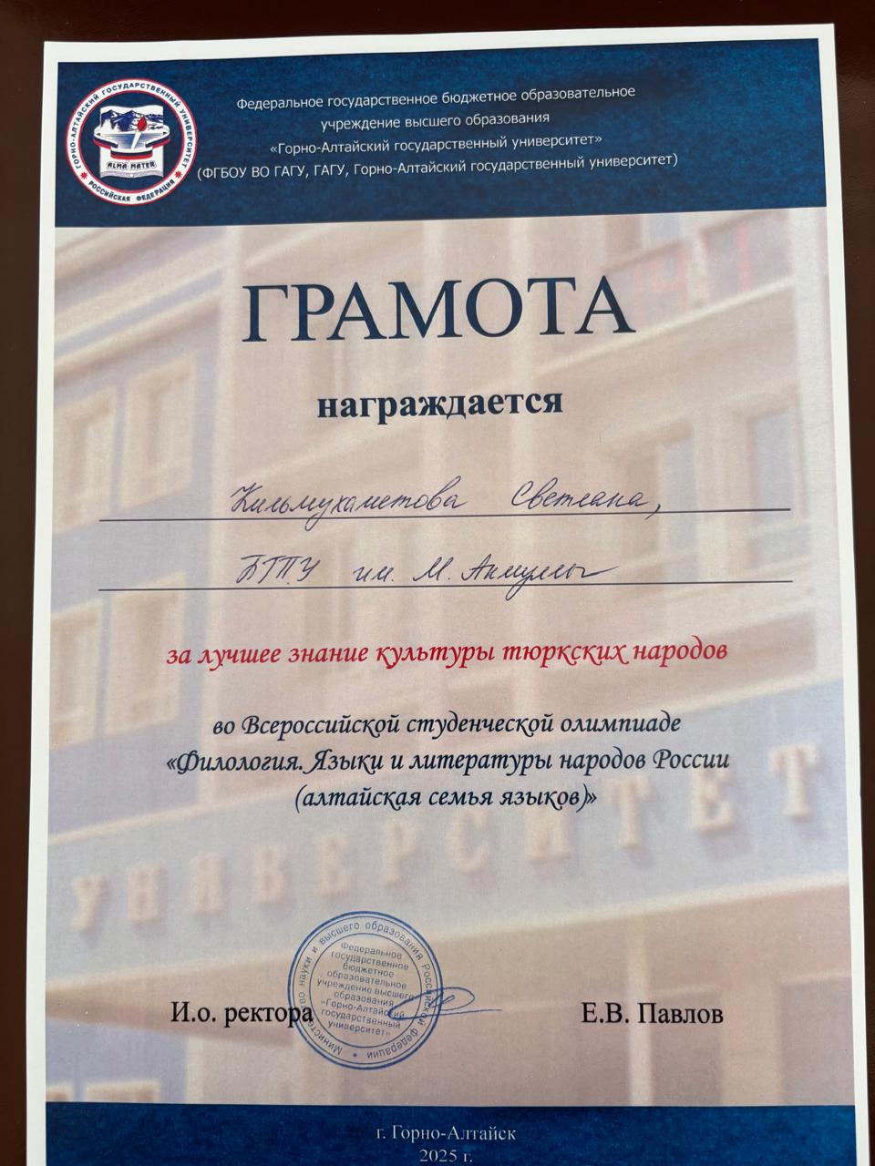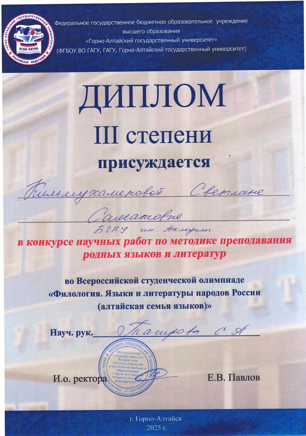 С 11 по 18 мая 2025 года в Республике Алтай на базе Горно-Алтайского государственного университета прошла Всероссийская студенческая олимпиада «Филология. Языки и литературы народов Российской Федерации (тюркская группа)». Участниками олимпиады стали команды из Башкортостана, Якутии, Хакасии, Тувы и Алтая.