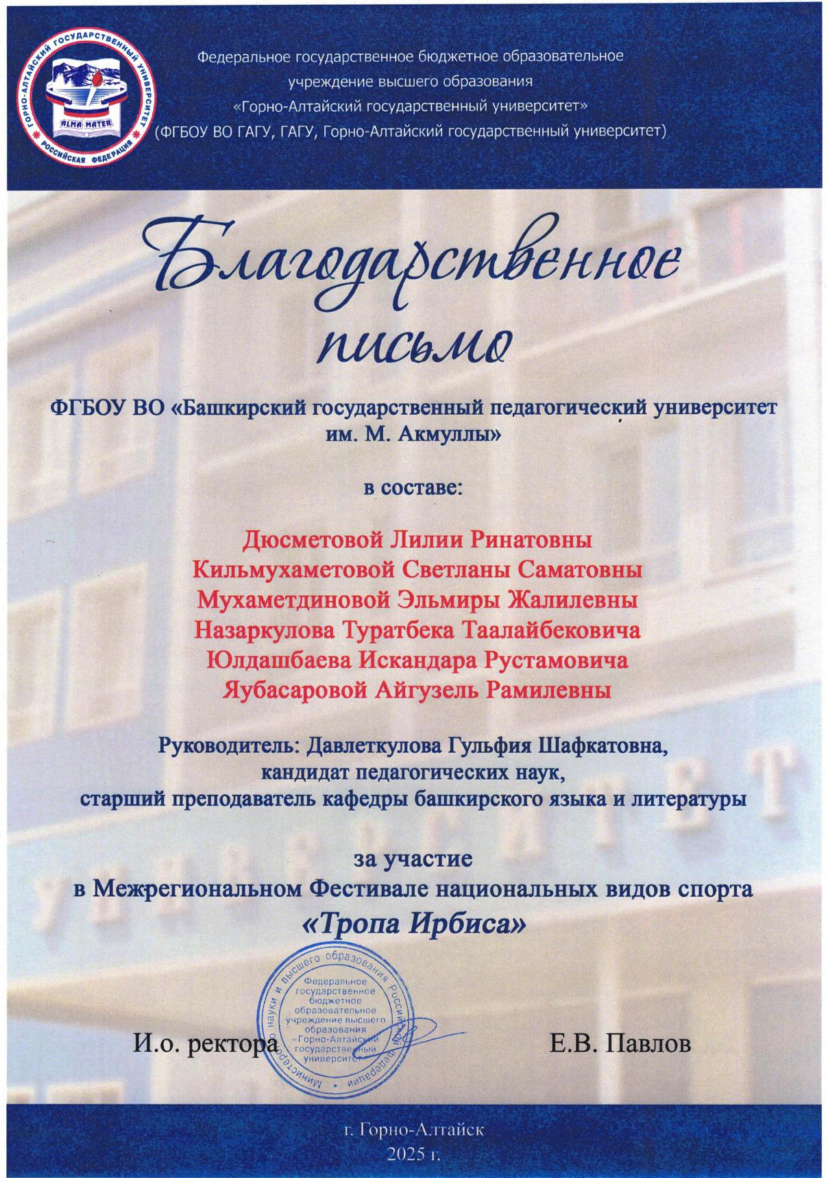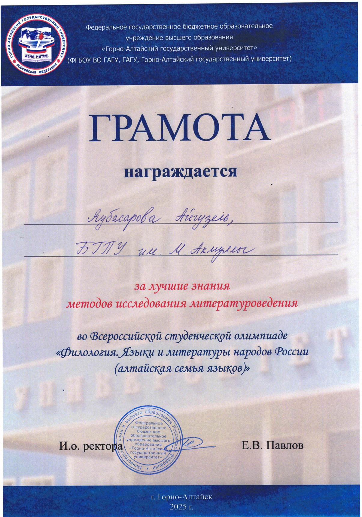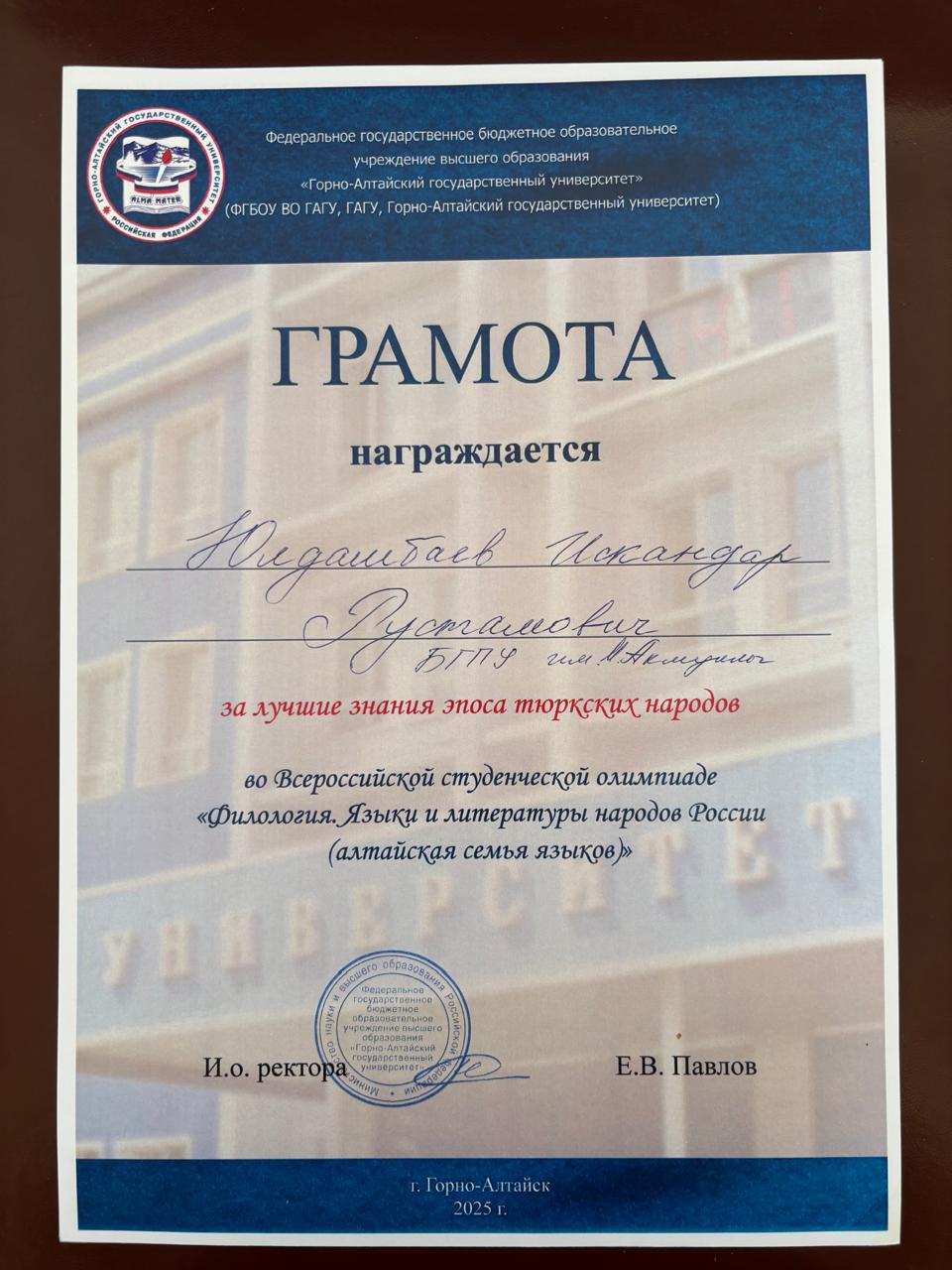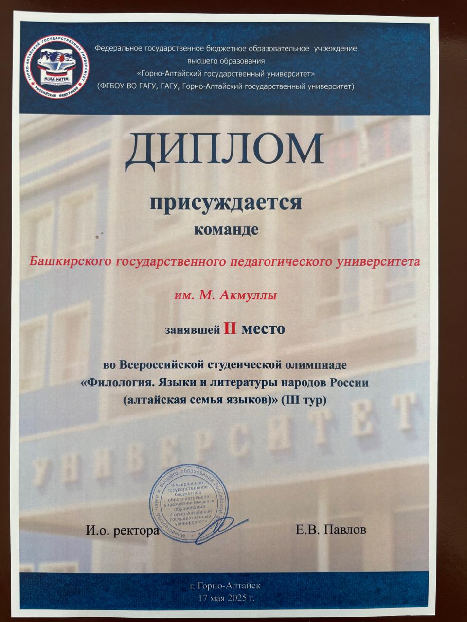 С 11 по 18 мая 2025 года в Республике Алтай на базе Горно-Алтайского государственного университета прошла Всероссийская студенческая олимпиада «Филология. Языки и литературы народов Российской Федерации (тюркская группа)». Участниками олимпиады стали команды из Башкортостана, Якутии, Хакасии, Тувы и Алтая.