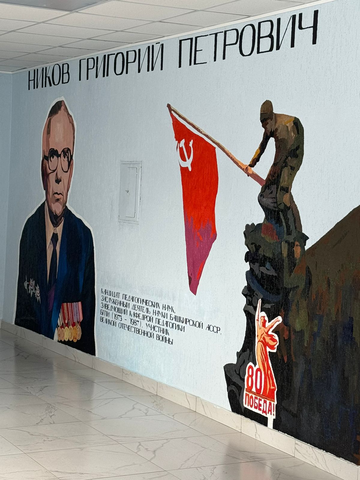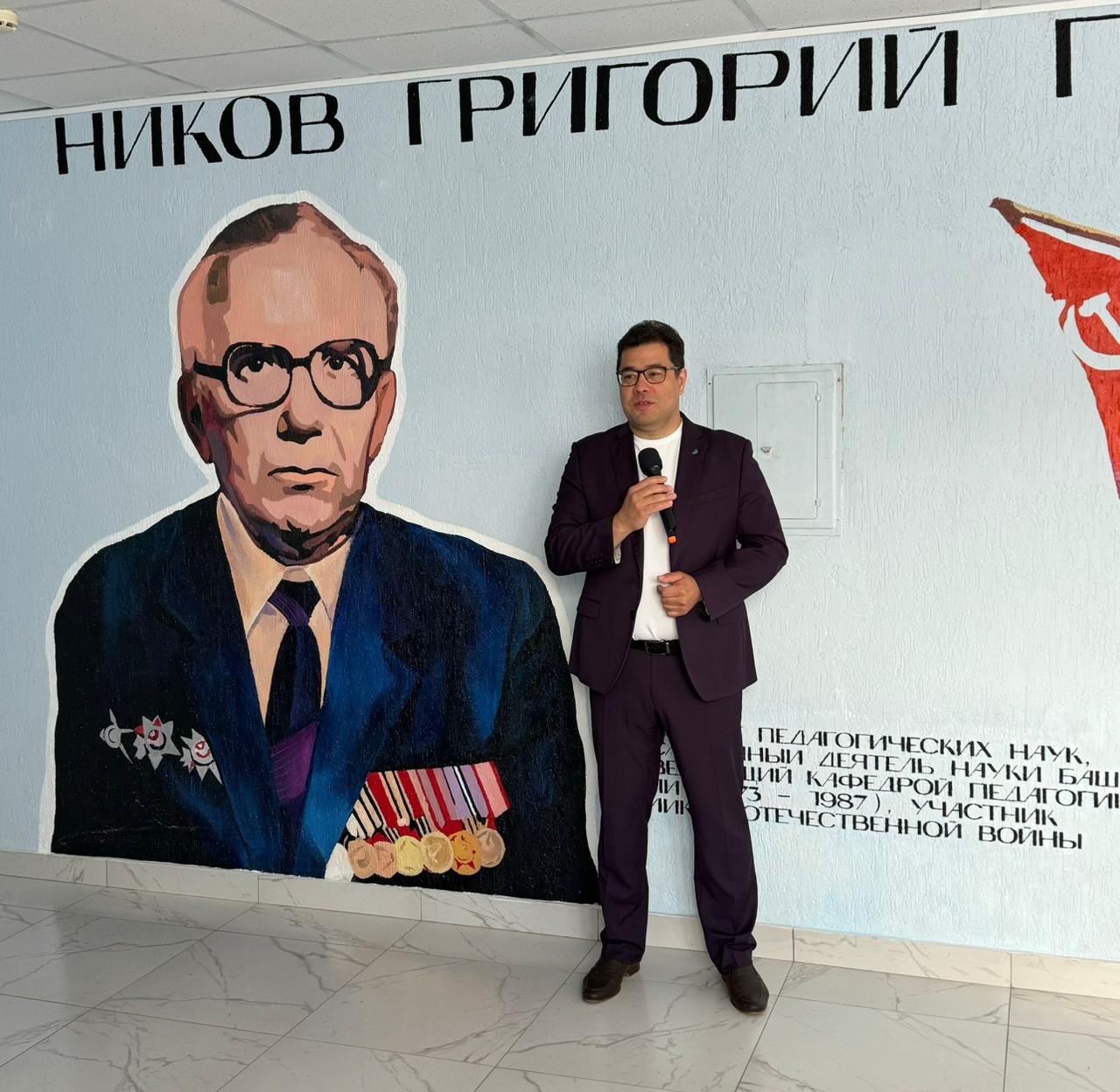 В Год 80-летия Великой Победы продолжается работа по сохранению памяти о преподавателях БГПУ имени М. Акмуллы – участниках Великой Отечественной войны. В Институте педагогики  сегодня торжественно открылся мурал, посвященный  Никову Григорию Петровичу, заслуженному деятелю науки Башкирской АССР, участнику Великой Отечественной войны, кандидату исторических наук, руководителю кафедры педагогики в 1973-1987 годах.