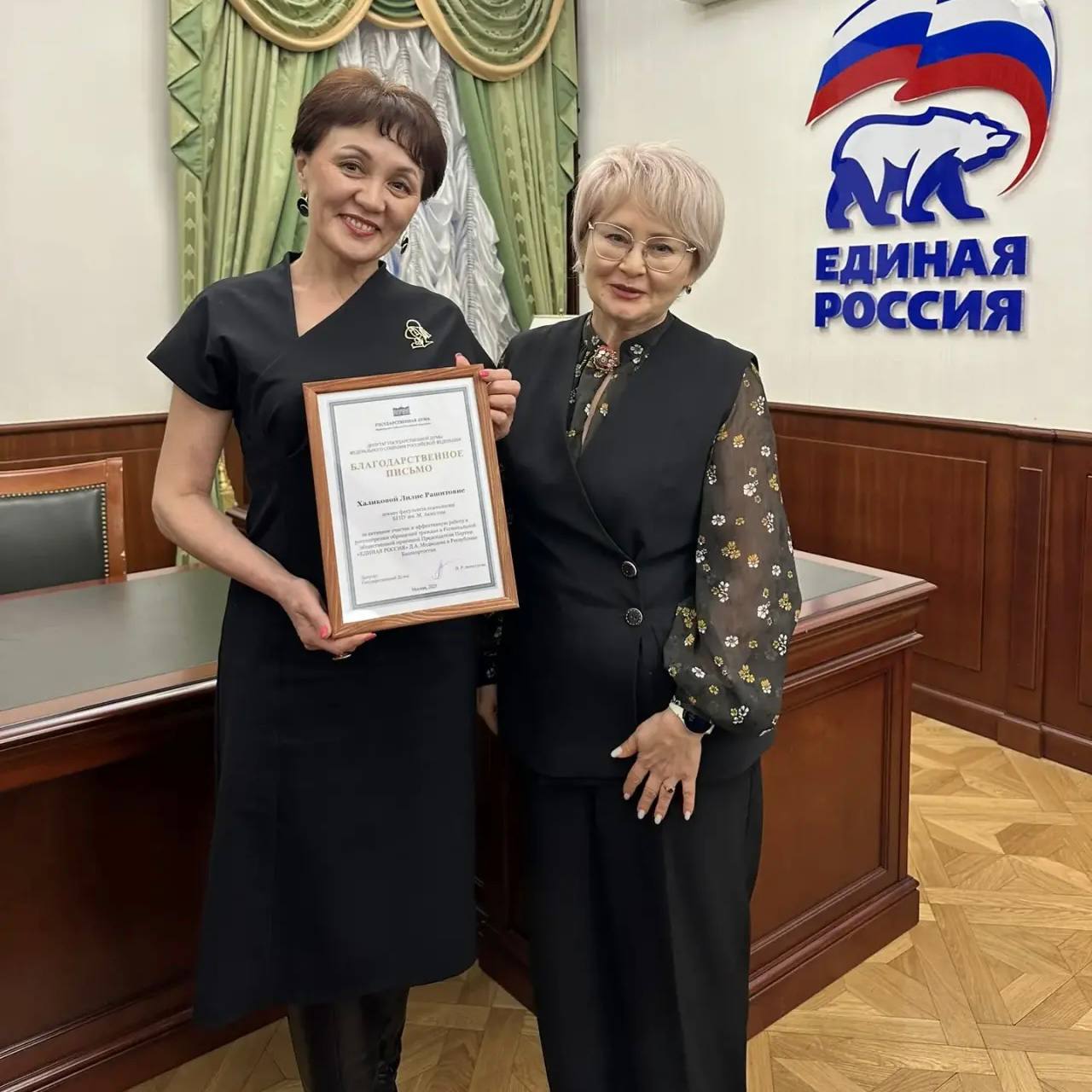 Эльвира Аиткулова вручила декану факультета психологии Лилии Халиковой благодарственное письмо  за активное участие и эффективную работу в рассмотрении обращений граждан в Региональной общественной приемной Председателя Партии «ЕДИНАЯ РОССИЯ»» Д.А. Медведева в Республике Башкортостан.