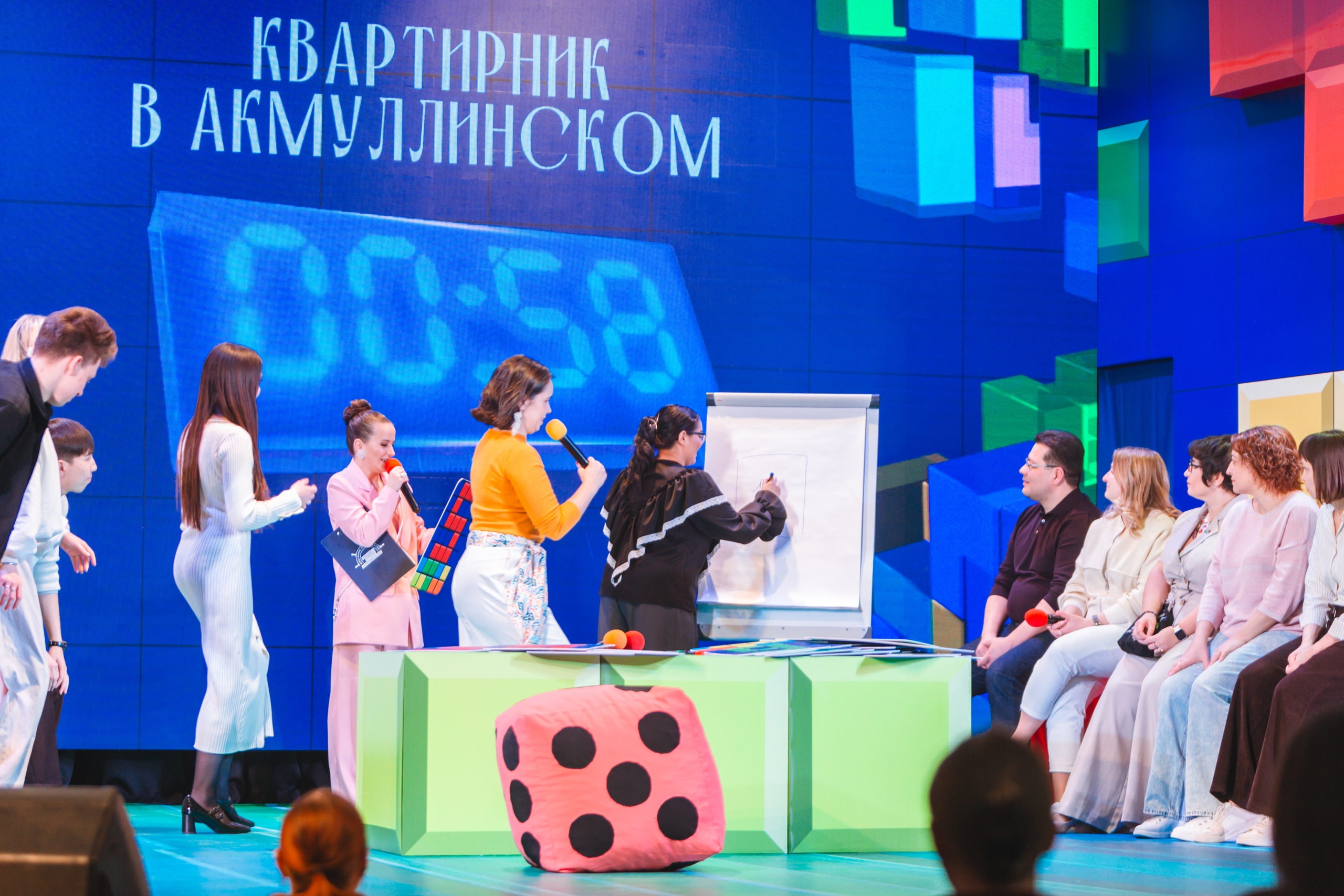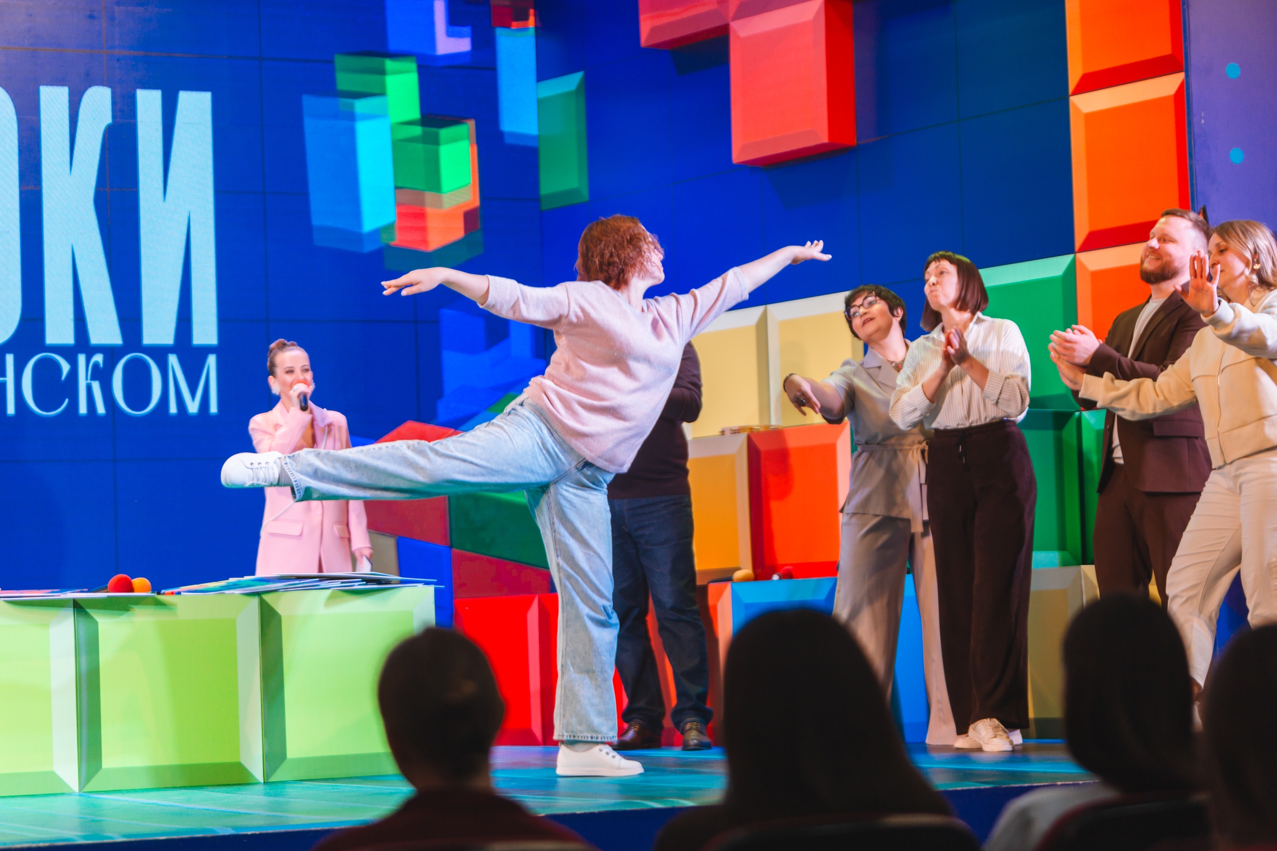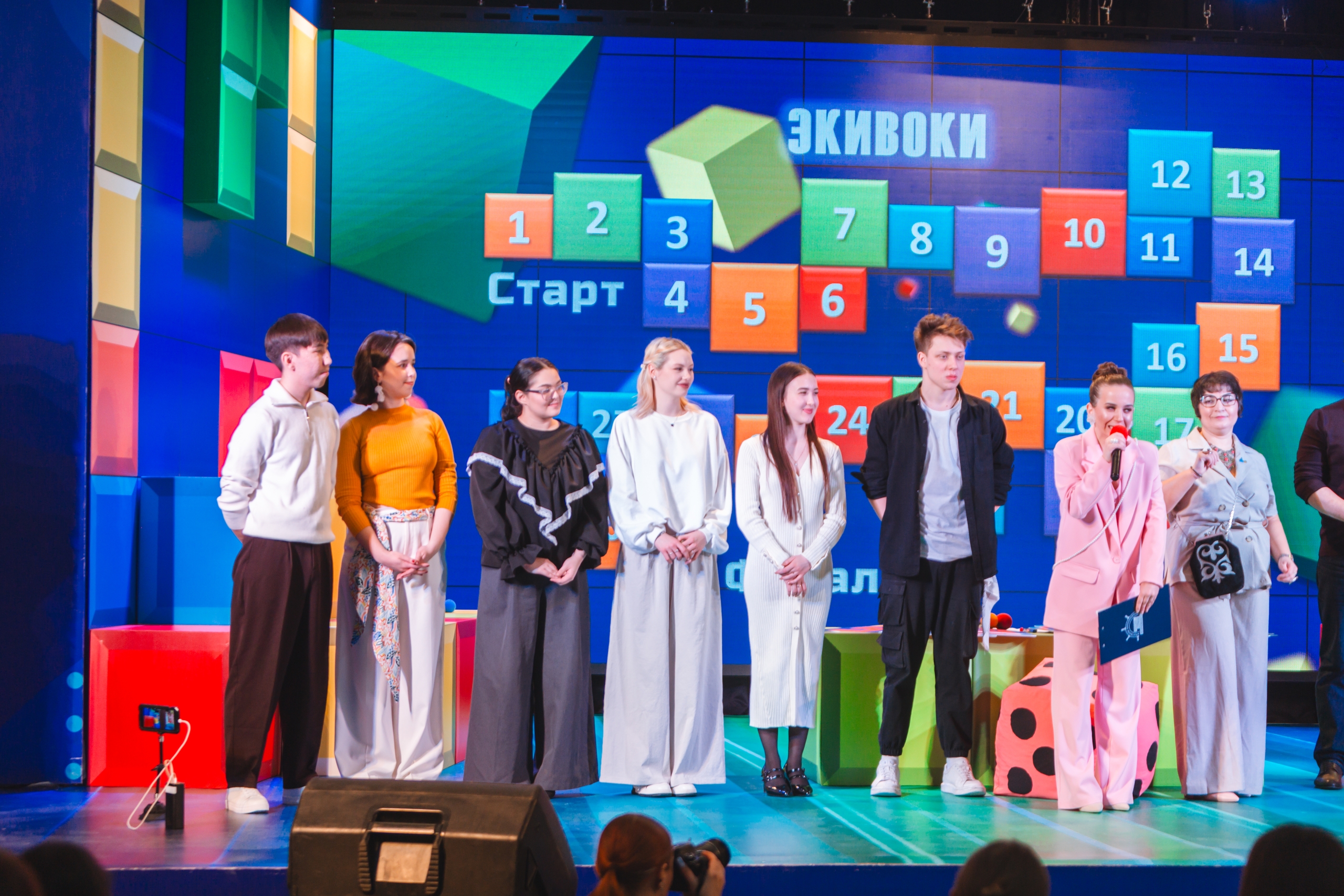 В этом году команды сразились в известную игру «Экивоки», они выполняли задания, отгадывали слова, пели и танцевали. А в зале их поддерживали болельщики.
