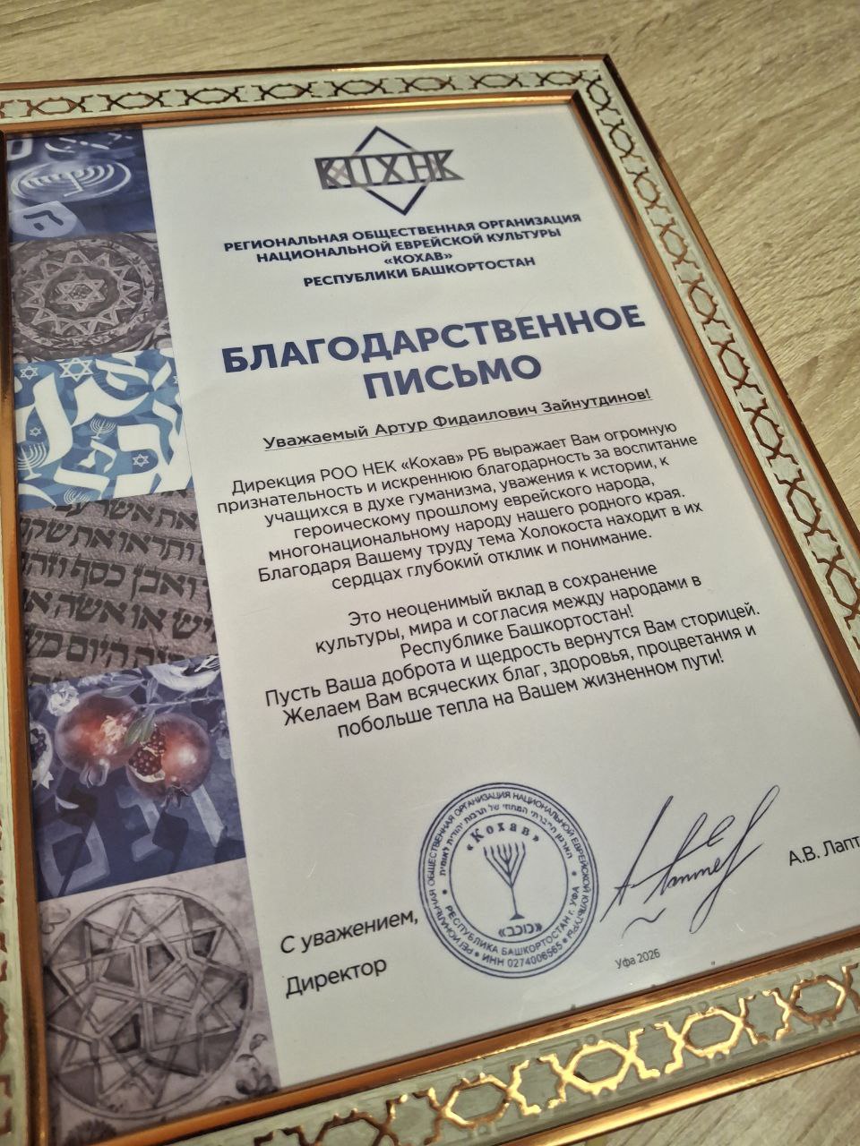 «Для меня большая честь и огромная ответственность быть в числе лауреатов этого года. Эта премия — не просто личное достижение, а важное признание работы всего нашего сообщества по сохранению исторической памяти. Спасибо Еврейской общине Башкортостана и всем партнёрам за высокую оценку нашего труда. Особые слова благодарности фонду «Президентских грантов», организации «Кохав» и уфимскому театру «Шалом-Алейхем» за поддержку этого проекта. Поздравляю всех коллег-лауреатов! Вместе мы продолжаем важное дело — чтобы память жила, а уроки истории не были забыты», - поделился эмоциями Артур Зайнутдинов .