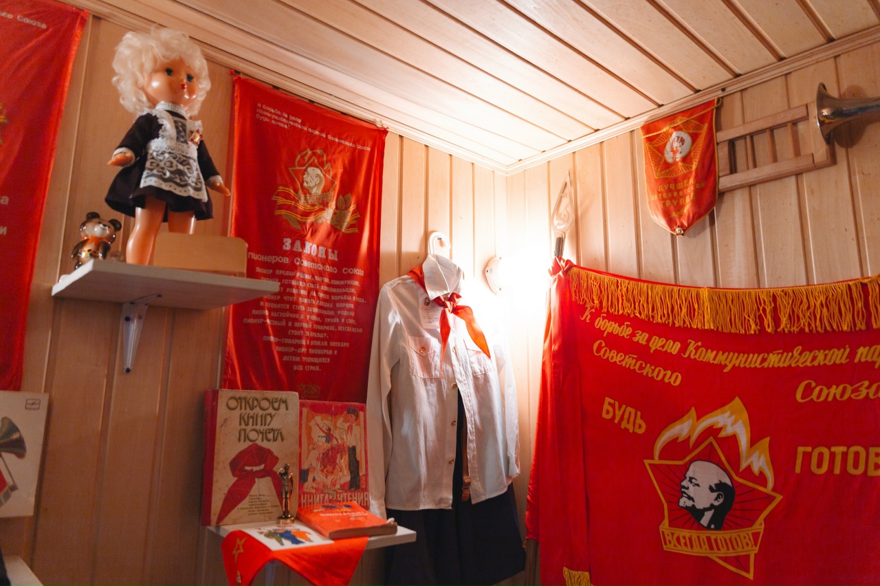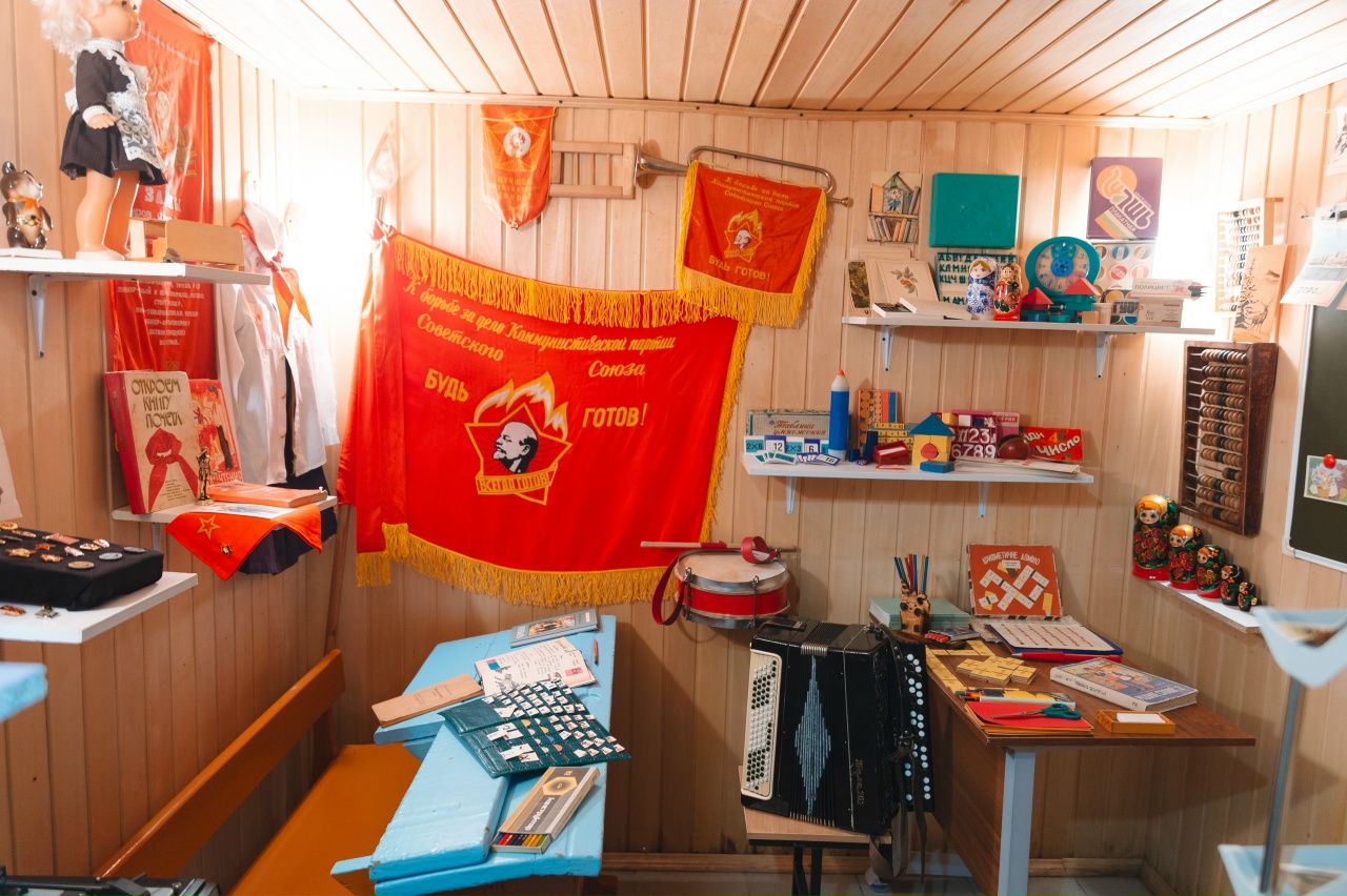На выставке представлены экспонаты времён СССР по темам гражданская оборона, медицина катастроф и школа безопасности. Небольшой, но очень познавательный музей расположился на двух этажах. Первый этаж посвящен быту советского школьника – октябренка, пионера, комсомольца. Экспонаты отражают жизнь и ценности людей советского времени.