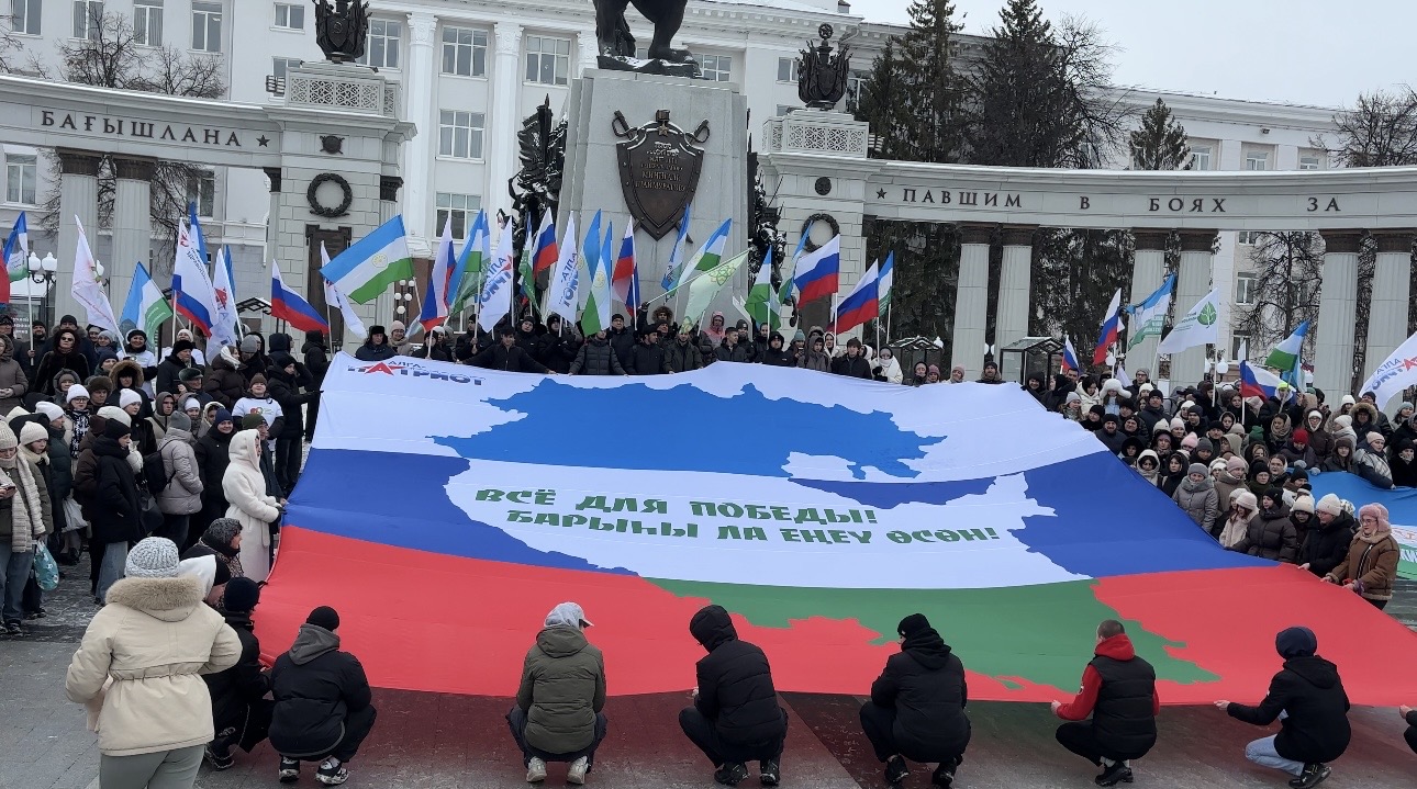 Участники мероприятия почтили минутой молчания память погибших защитников, возложили цветы к памятнику, а затем развернули полотнище с лозунгом «Всё для Победы!», баннеры и флаги башкирских батальонов.