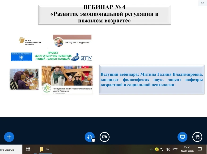 На факультете психологии 16 марта прошёл четвёртый обучающий вебинар, посвящённый особенностям эмоциональной регуляции в пожилом возрасте. Его провела доцент кафедры возрастной и социальной психологии Галина МитинаА уже 19 марта в геронтологическом центре «Именлек» прошло четвёртое занятие проекта «Благополучие пожилых людей – важен каждый!».