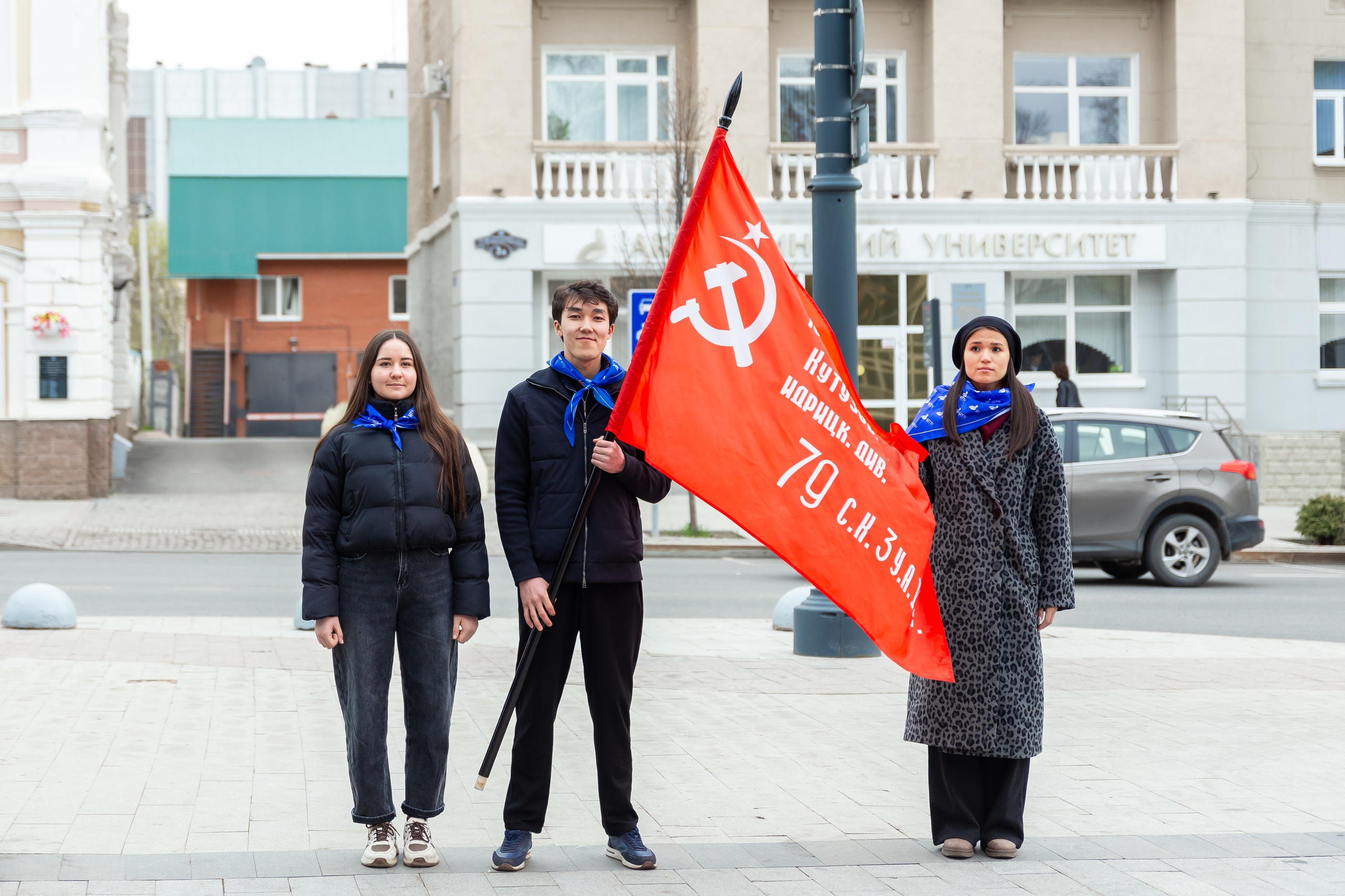 Почетное право поднять государственные флаги на площади перед вузом получили студенты, имеющие особые достижения в общественной, спортивной и учебной деятельности: