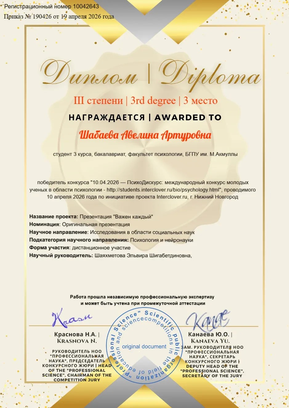 Студентка третьего курса факультета психологии Авелина Шабаева заняла почетное III-е место, продемонстрировав высокие результаты на международной арене. Ее видеопрезентация, посвященная социальному проекту "Благополучие пожилых людей – важен каждый", была высоко оценена экспертами.