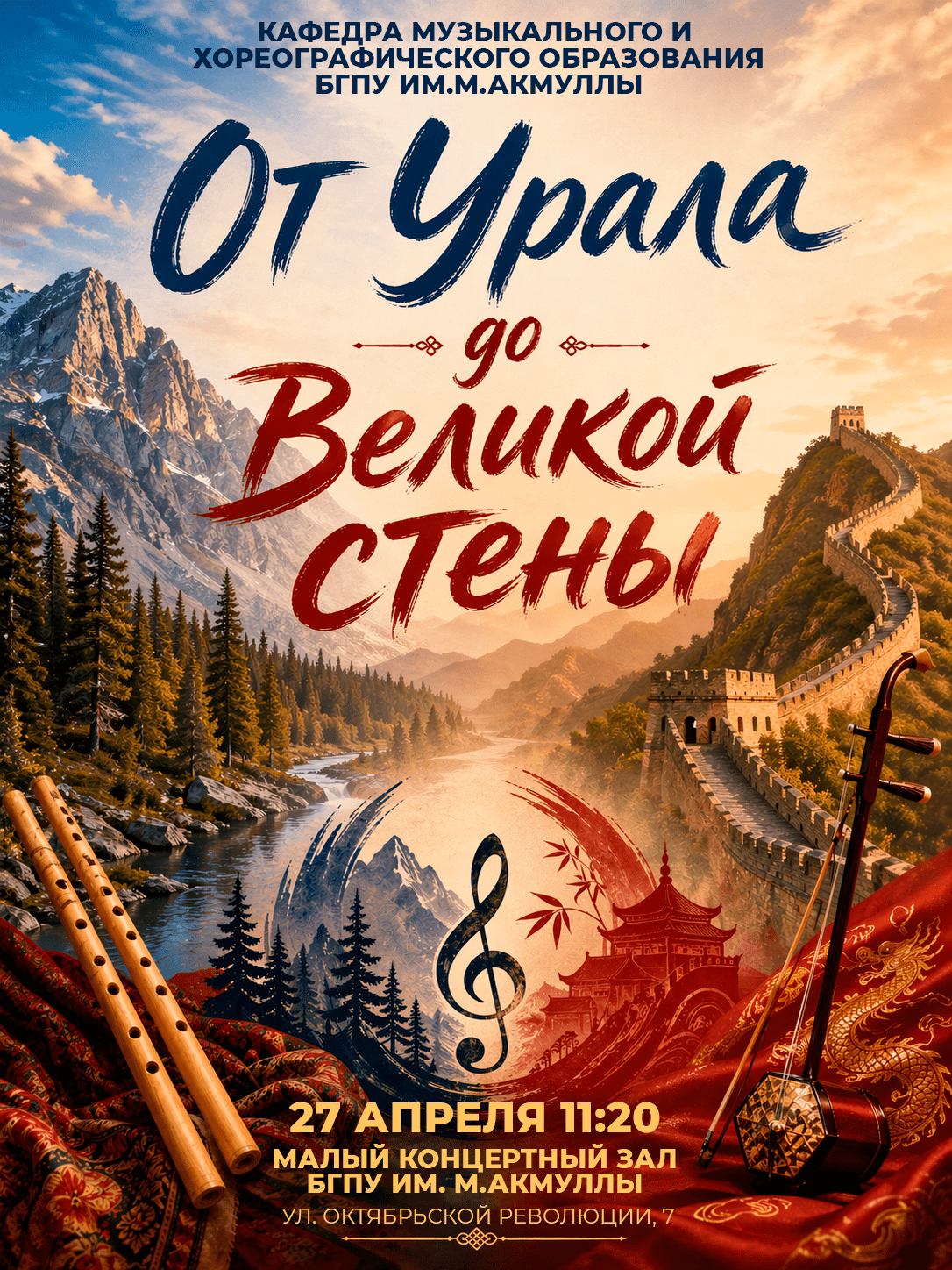 27 апреля в 11.20 ч. в Акмуллинском университете состоится концерт «От Урала до Великой стены», посвященный Году образования Китая и России, а также реализации культурно-просветительского проекта «Музыкальная гостиная».