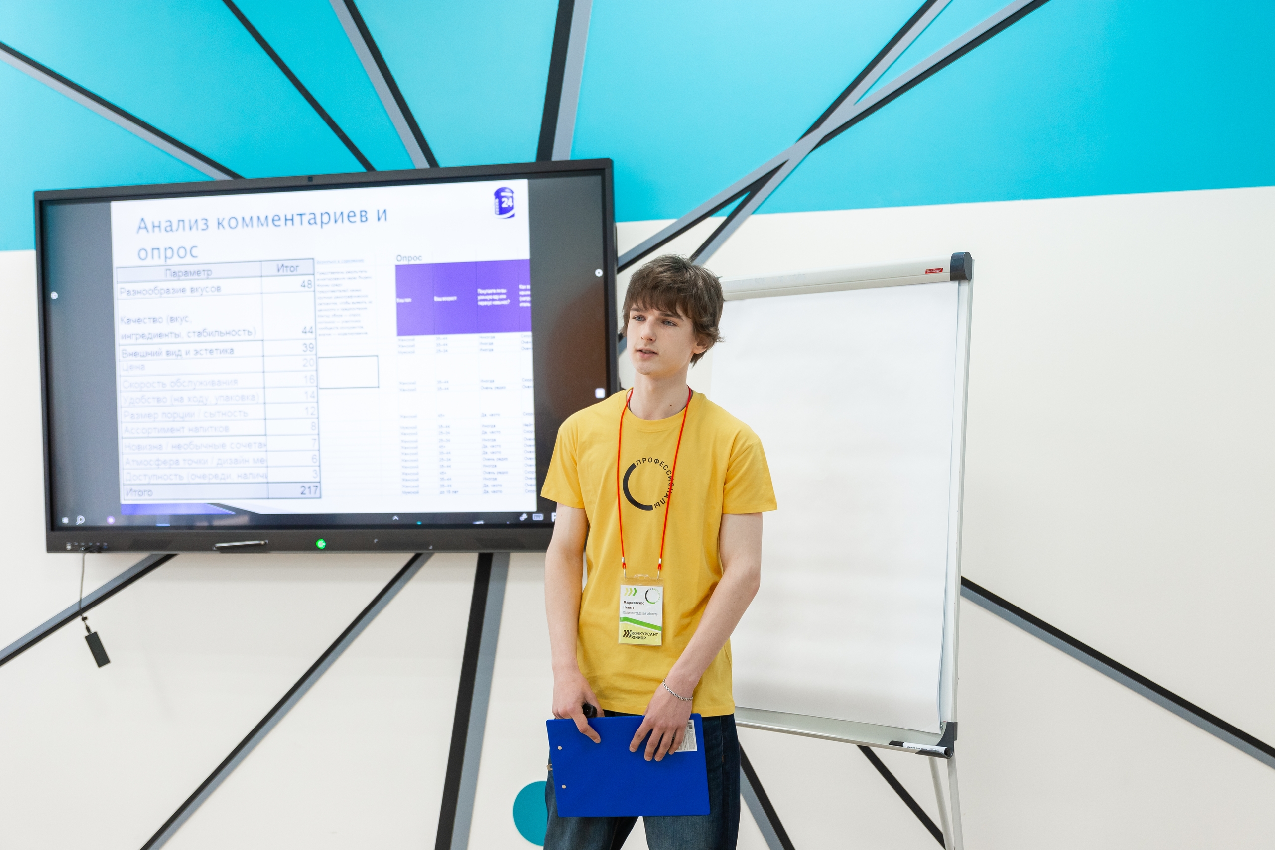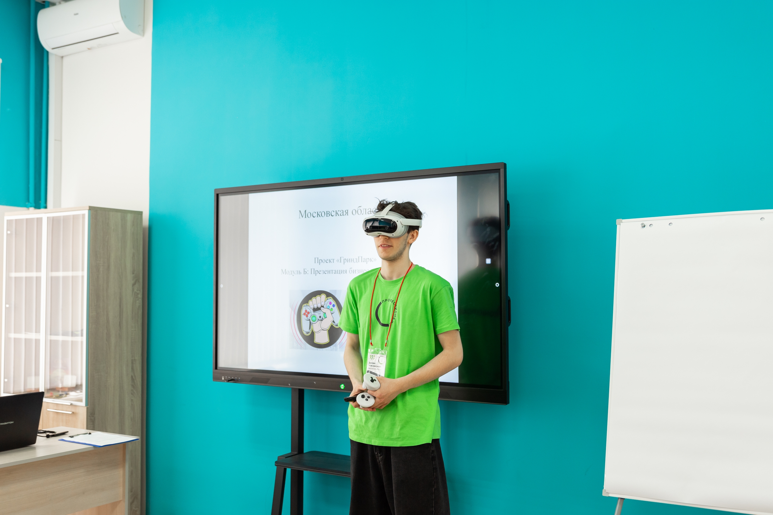 Студент колледжа из Московской области Вадим Дмитриев представляет экспертам бизнес-проект по открытию киберклуба с игровыми приставками и зоной VR.
