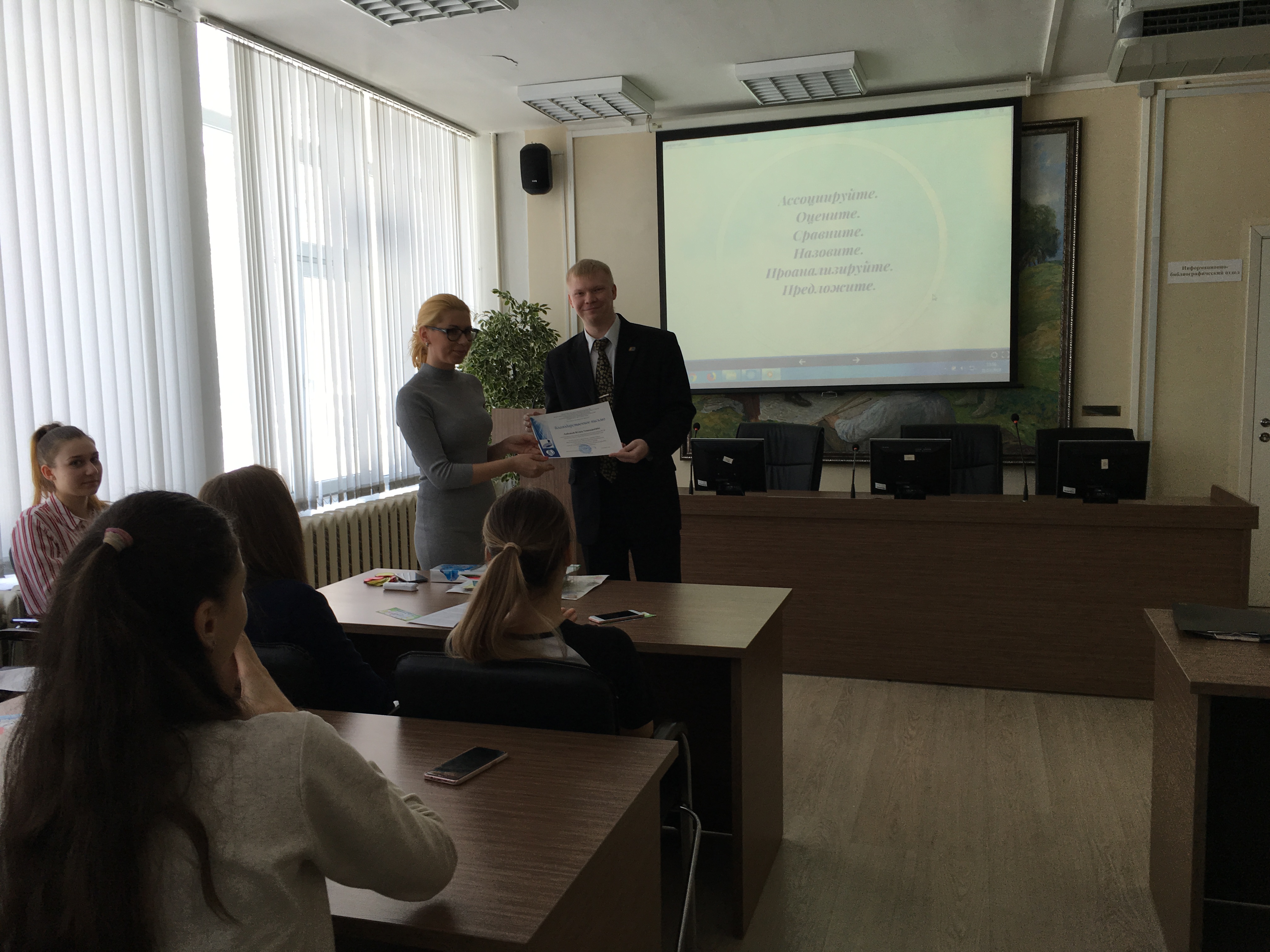 В завершении мероприятия заведующий отделом редких книг библиотеки Алексей Олегович Иванов вручил Юлии Геннадьевне Лобовой благодарственное письмо от университета за проведение мастер-класса и отметил, что он был очень полезен для студентов выпускных курсов ЕГФ, а также для присутствовавших школьников.