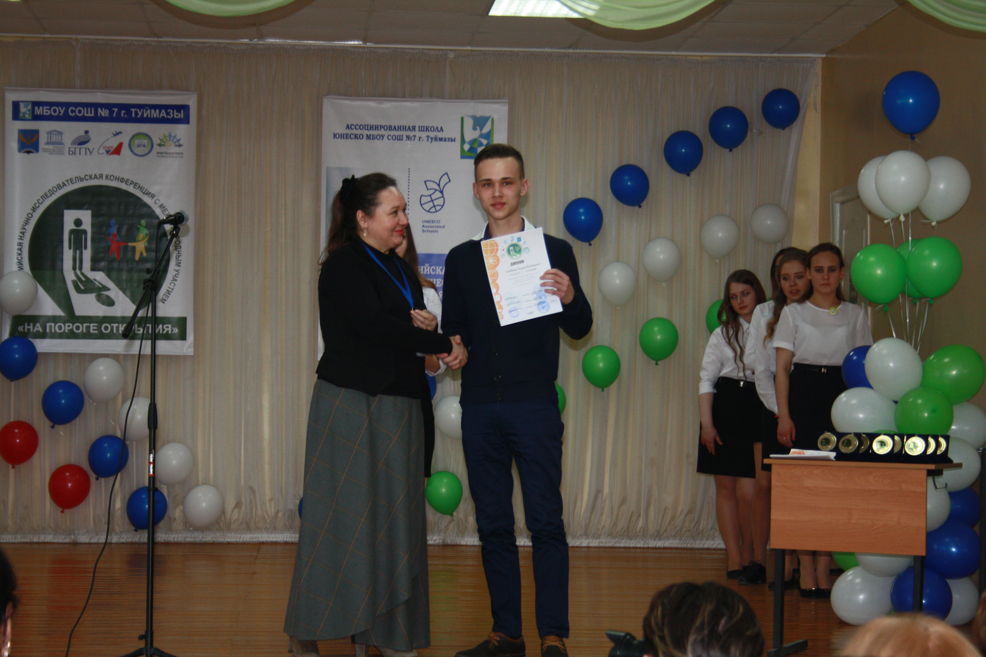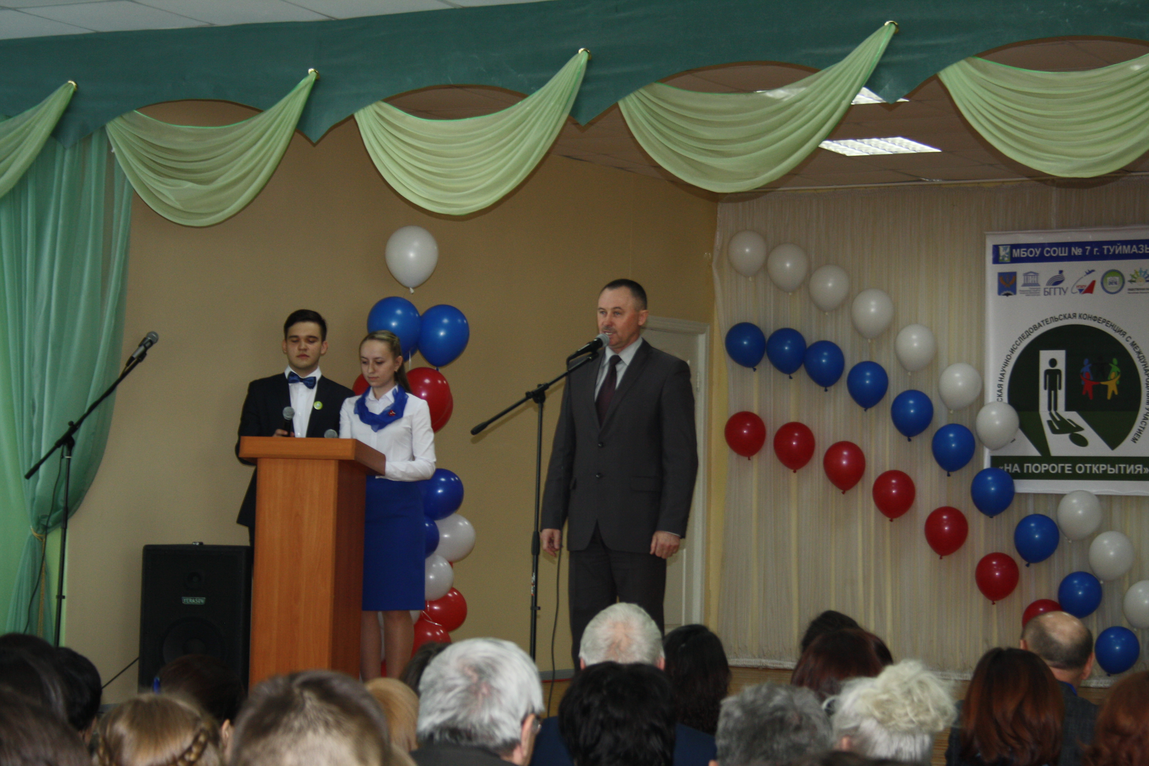30 марта на базе МБОУ СОШ№7 г.Туймазы прошла конференция с международным участием «На пороге открытия». Организаторами конференции выступили Управление образования муниципального района Туймазинский район, Общественная палата РБ, БГПУ, УГАТУ, ИРО РБ. На конференции приняло участие 437 человек с 5 до 25 лет из Республики Башкортостан, 10 субъектов Российской Федерации(Москва, Санкт-Петербург, Астраханская область, Якутия, Иркутская область, Удмуртская Республика, Курская область, Ульяновская область, Ханты-Мансийский автономный округ, Республика Татарстан), 9 стран ближнего и дальнего зарубежья (Беларусь, Узбекистан, Казахстан, Ангола, Германия, США, Нидерланды, Вьетнам, Йемен). Результаты исследований участников конференции были заслушаны в 28 секциях. В качестве экспертов были приглашены более 60 экспертов из числа профессорско-преподавательского состава ведущих вузов и ССУЗов республики, заслуженные деятели в различных областях.