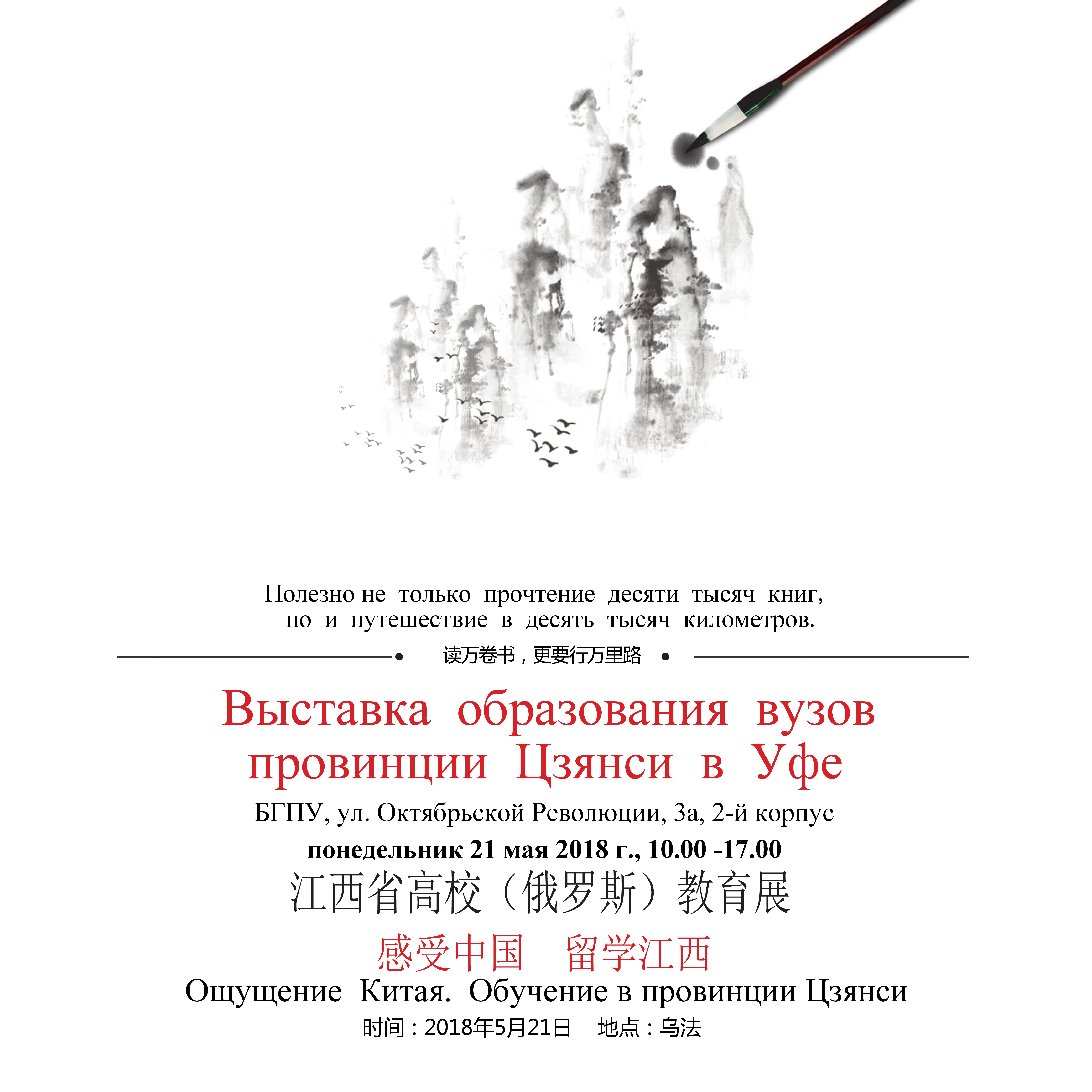 21 мая в Уфе пройдет образовательная выставка университетов провинции Цзянси (Китай). Вход для всех желающих свободный. Время работы: с 10.00 до 17.00 часов. Место проведения выставки - БГПУ имени М.Акмуллы по адресу: г.Уфа, ул. Октябрьской революции, 3а.