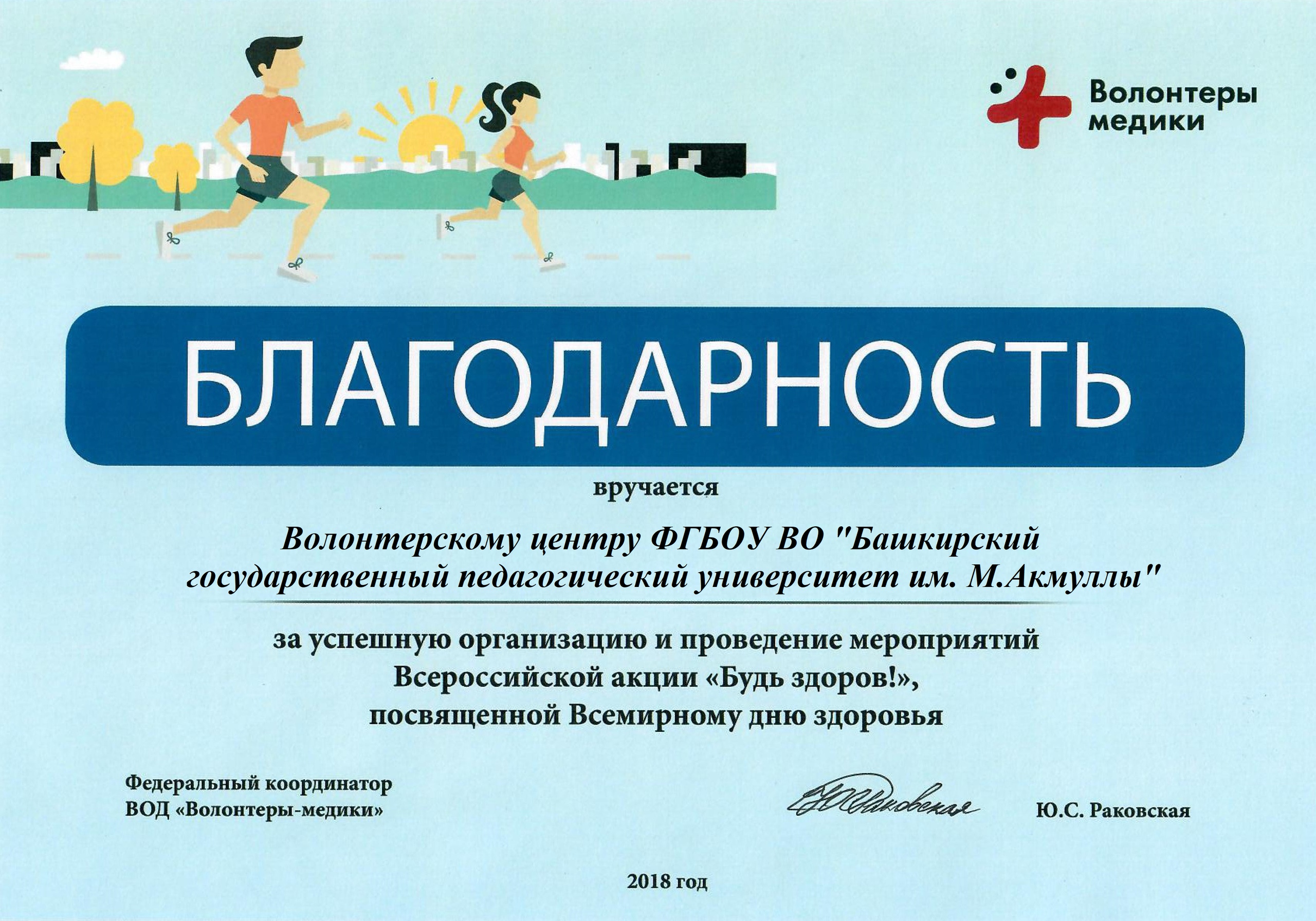 Волонтерский центр БГПУ им. М. Акмуллы отмечен благодарственным письмом федерального координатора Всероссийского общественного движения «Волонтеры-медики» за успешную организацию мероприятий Всероссийской акции «Будь здоров!», посвященной Всемирному дню здоровья.