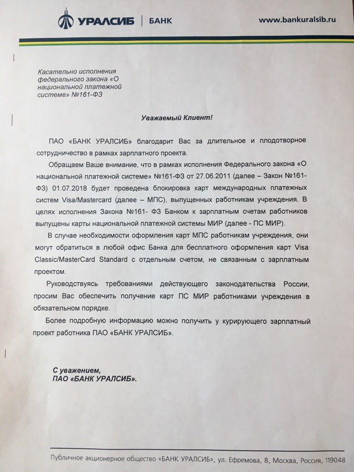 ПАО «БАНК УРАЛСИБ» обращаете Ваше внимание, что 1.07.2018 будет проведена блокировка карт международных платежных систем Visa/Mastercard, выпущенных работникам учреждения.