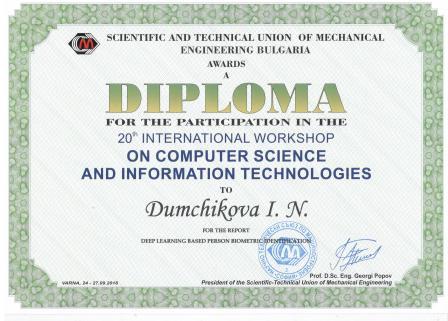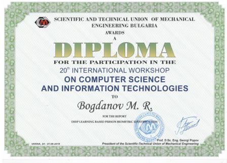 С 24 по 27 сентября в городе Варна, Болгария проходила конференция по компьютерным технологиям (The 20-th International workshop on computer science and information technologies), проводимая Советом инженеров-механиков Болгарии (Scientific and technical union of mechanical engineering Bulgaria) и факультетом информатики и робототехники УГАТУ. Доцент кафедры прикладной информатики БГПУ им.М.Акмуллы Богданов М.Р. и магистрант Думчикова И.Н. представили работу по биометрической идентификации личности (Deep learning based person biometric identification), которая была опубликована в сборнике материалов конференции и международном журнале Industry 4.0.