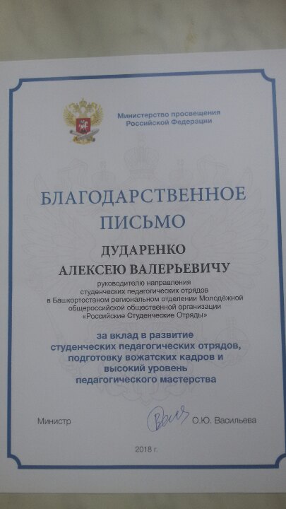 Алексей Валерьевич Дударенко получил Благодарственное письмо от Министерства Просвещения РФ за вклад в развитие студенческих педагогических отрядов, подготовку вожатских кадров и высокий уровень педагогического