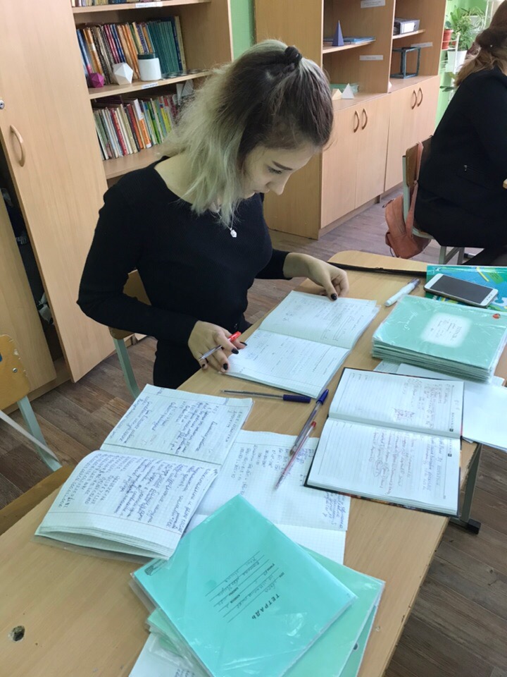 С первого дня мы сразу же погрузились в работу учителя математики с головой: проверяли тетради, самостоятельные и контрольные работы; помогали нашим учителям-наставникам заполнять электронный журнал; проводили индивидуальные занятия с отстающими школьниками; с большим интересом и вниманием наблюдали за ходом уроков у разных учителей математики, и даже некоторые из нас пробовали проводить уроки.