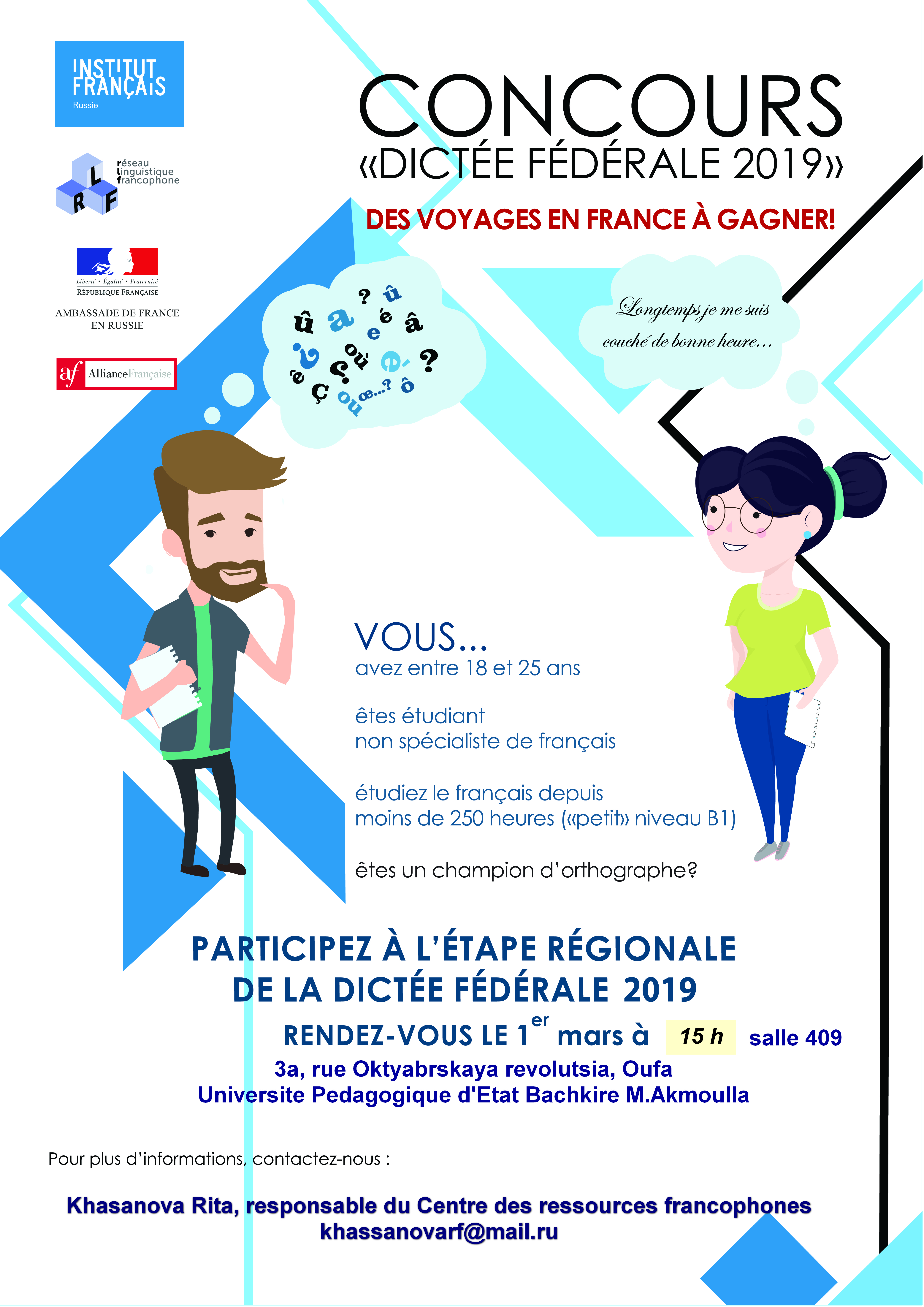 2 этап – федеральный – состоится 21 марта в Москве в Институте французского языка. На федеральный этап будут приглашены по результатам конкурсного отбора победители регионального этапа. Институт французского языка берет на себя расходы на проезд и проживание участников акции.