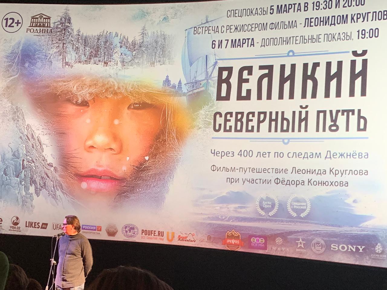 Круглов рассказал о фильме-экспедиции на край земли "Великий Северный путь". Вместе со своей командой он преодолел путь в 10 тыс. километров по российской Арктике, повторив маршрут казака-землепроходца Семёна Дежнёва. Преодолев этот километраж на собаках, оленях, лодках, вертолётах, Леонид прошёл через полюс холода от Архангельска до Берингова пролива.