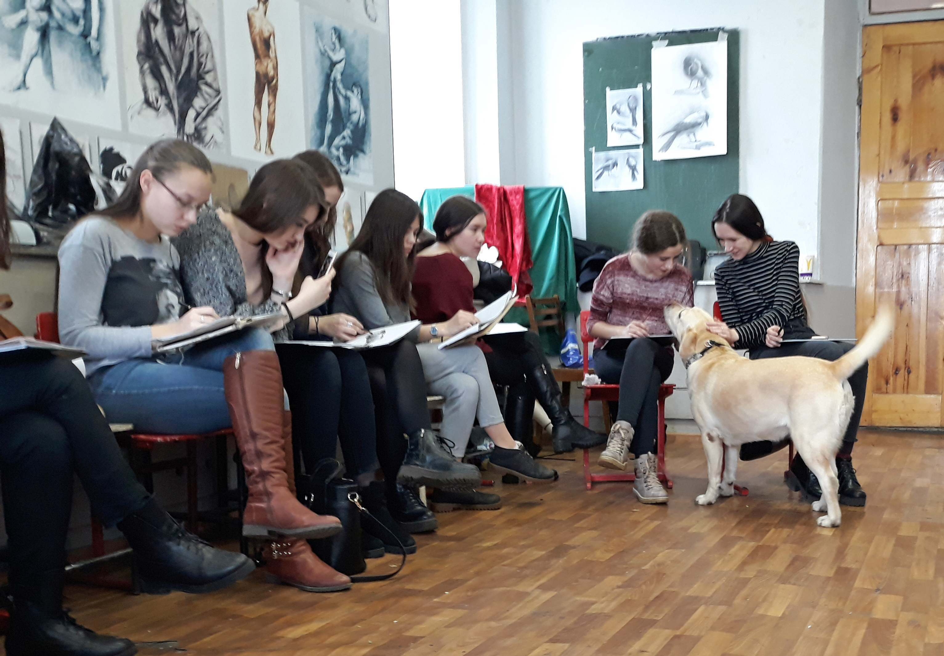 Встреча прошла в теплой душевной атмосфере. В ходе мероприятия студенты выполнили натурные наброски и зарисовки собак, лучшие из которых были подарены гостям. Представители клуба ответили на все интересующие вопросы ребят.