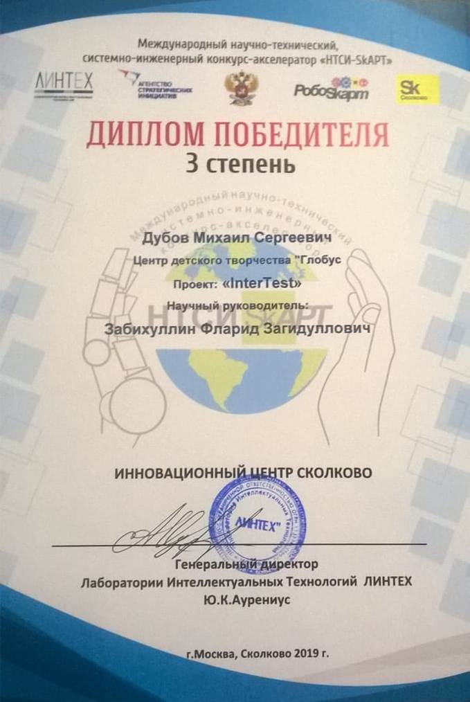 3 степень - "InterTest" (автор: Дубов Михаил Сергеевич, Россия, Уфа, Центр детского творчества «Глобус» «Технопарк Город Будущего», научный руководитель - к.п.н., доцент ФГБОУ ВО БГПУ им. М. Акмуллы Ф.З.Забихуллин)
