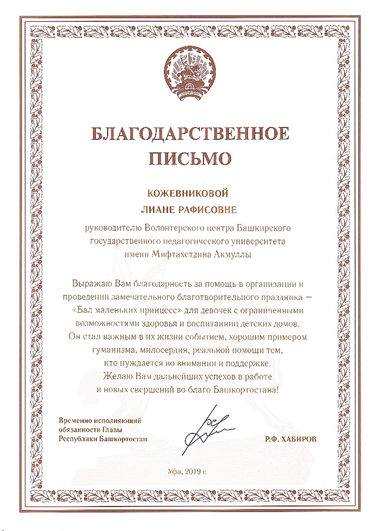 Работа добровольцев Волонтерского центра БГПУ им. М. Акмуллы на празднике «Бал маленьких принцесс» была отмечена благодарственным письмом врио главы Республики Башкортостан Радия Хабирова.