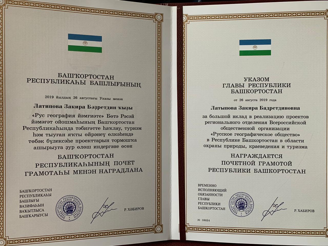 Доцент кафедры экологии, географии и природопользования Латыпова Закира Бадретдиновна Указом Главы Республики Башкортостан от 26.08.2019 г. награждена Почетной Грамотой Республики Башкортостан и Благодарностью Всероссийской общественной организации «Русское географическое общество».