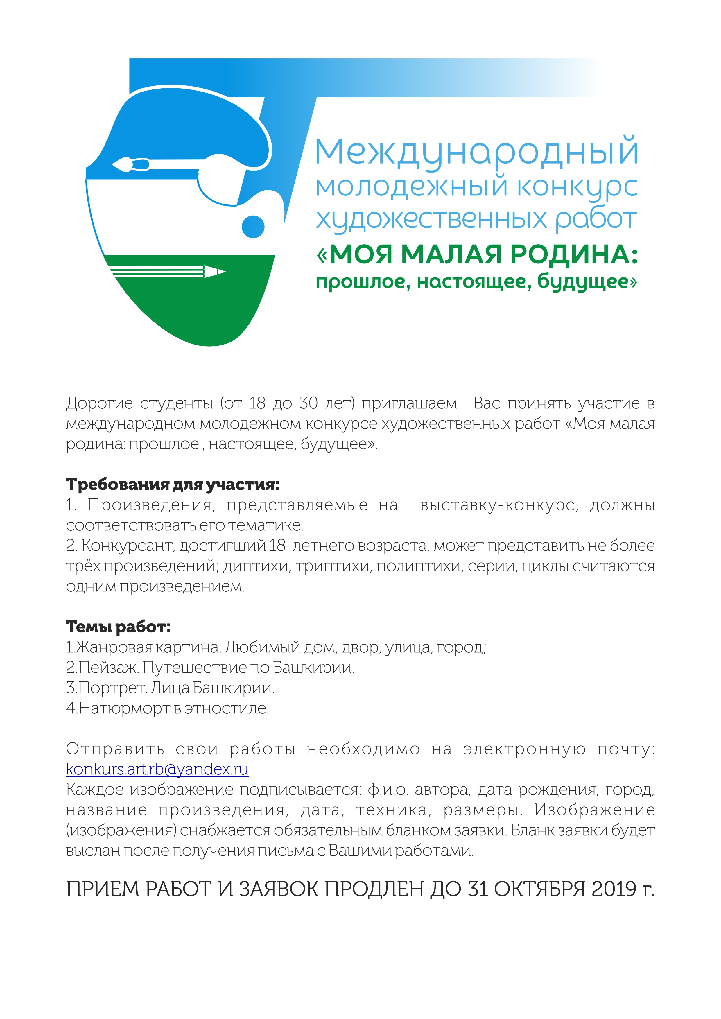 Дорогие студенты, прием работ и заявок на Международный молодежный конкурс художественных работ «Моя малая Родина: прошлое, настоящее, будущее» продлен до 31 октября 2019 года.