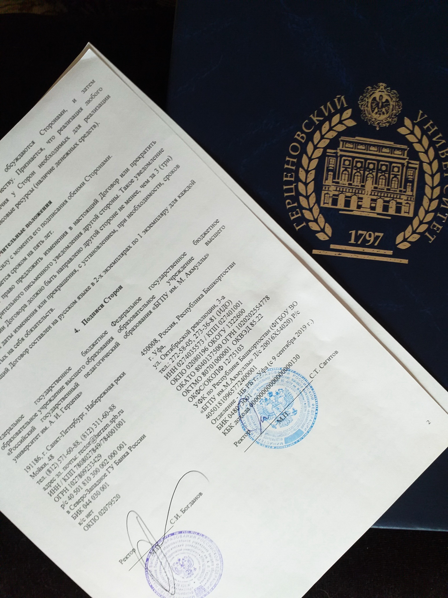 В процессе пребывания в Санкт-Петербурге был подписан Договор о сотрудничестве между Башкирским государственным педагогическим университетом им. М. Акмуллы и Российским государственным педагогическим университетом им  А. И. Герцена. Предметом договора является установление и развитие долгосрочного, эффективного и взаимовыгодного сотрудничества вузов в области образования и науки.