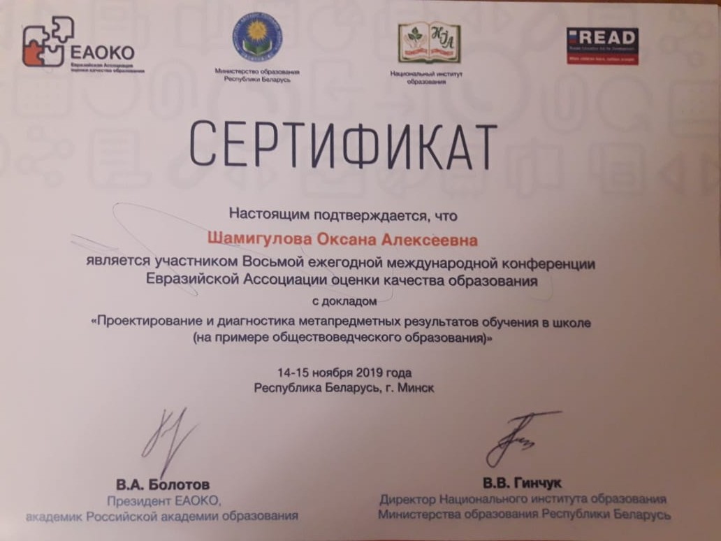 С 13 по 15 ноября 2019 года заведующая кафедрой права и обществознания ИИПО Шамигулова О.А. принимала участие в ежегодной Международной конференция Евразийской ассоциации оценки качества образования, организованной совместно с Министерством образования Республики Беларусь и научно-методическим учреждением "Национальный институт образования" Министерства образования Республики Беларусь. Конференция состоялась в городе Минске.