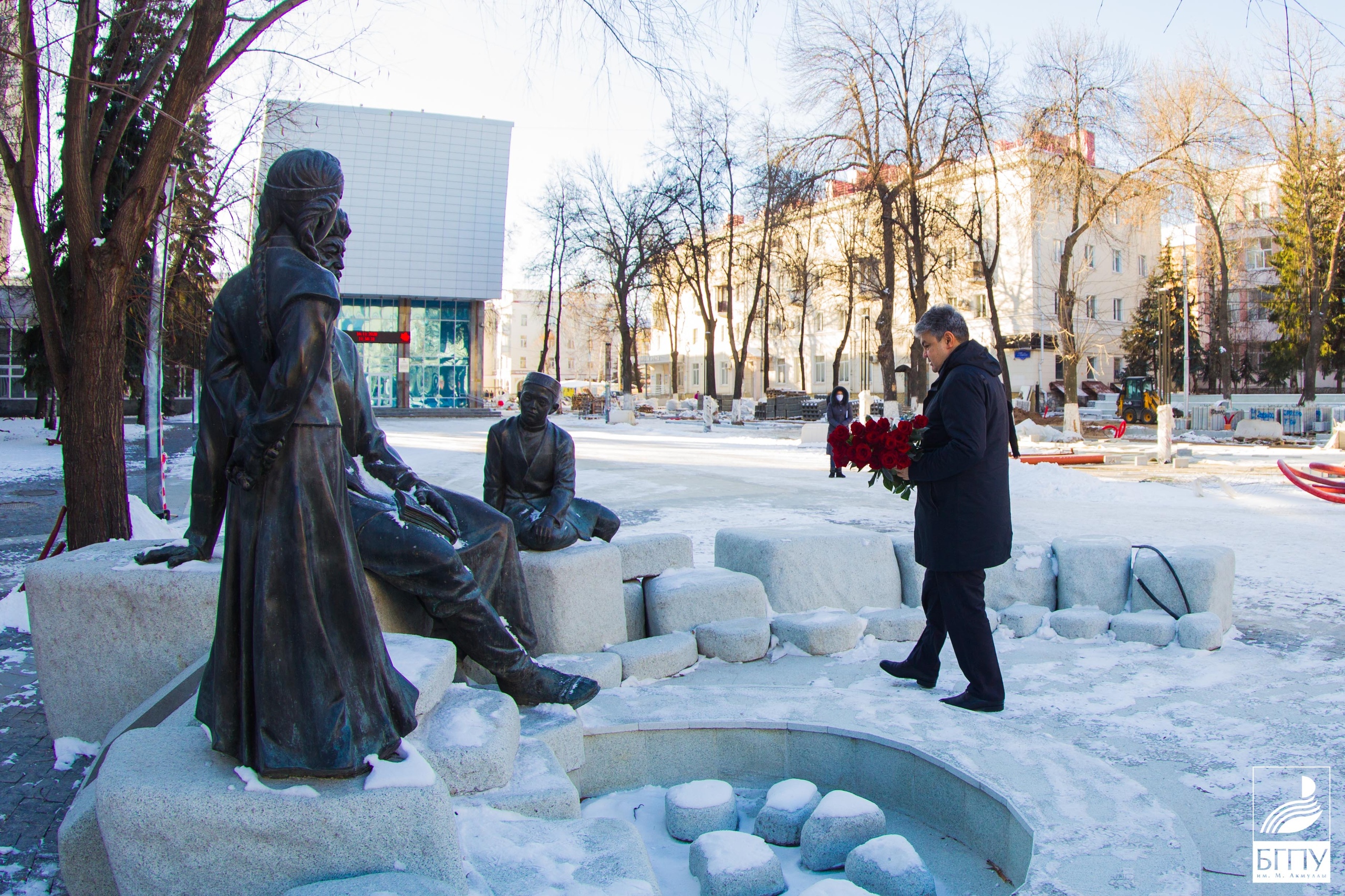 Визит гостей из Казахстана начался с возложения цветов к памятнику великому просветителю Мифтахетдину Акмулле, установленному на площади около Башгоспедуниверситета.