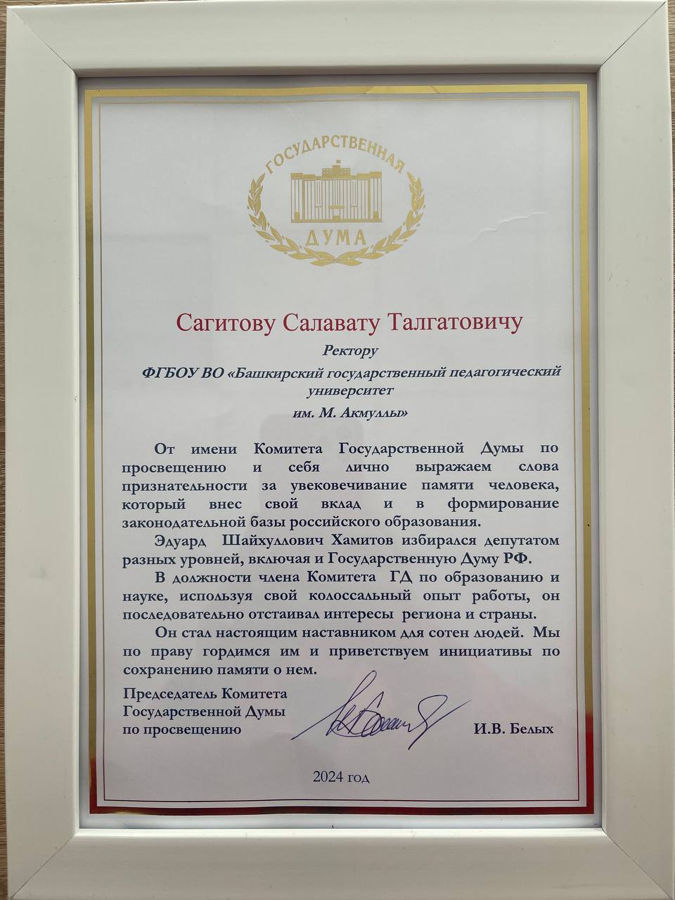 В адрес университета поступило письмо от председателя Комитета Государственной Думы по просвещению Ирины Белых, в котором она выразила слова признательности за увековечивание памяти человека, который внес свой вклад в формирование законодательной базы российского образования, последовательно отстаивал интересы региона и страны в должности члена Комитета ГД по образованию и науке.