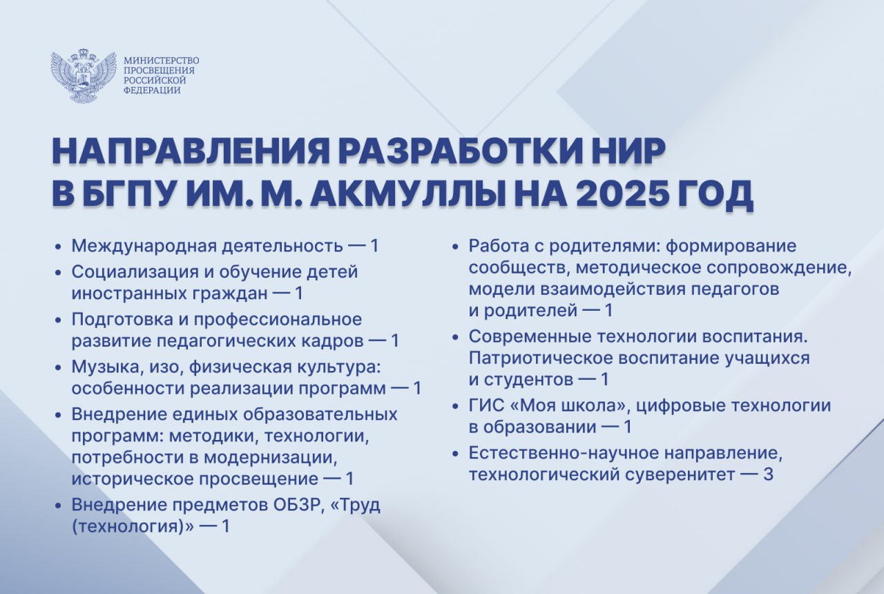 Всего в 2024 году научными коллективами Акмуллинского университета реализовано свыше 90 научно-исследовательских работ, в том числе по заказу Министерства просвещения РФ (всего восемь НИР, из них пять прикладных и три фундаментальные работы) и сетевых конкурсов с педагогическими вузами-партнерами.