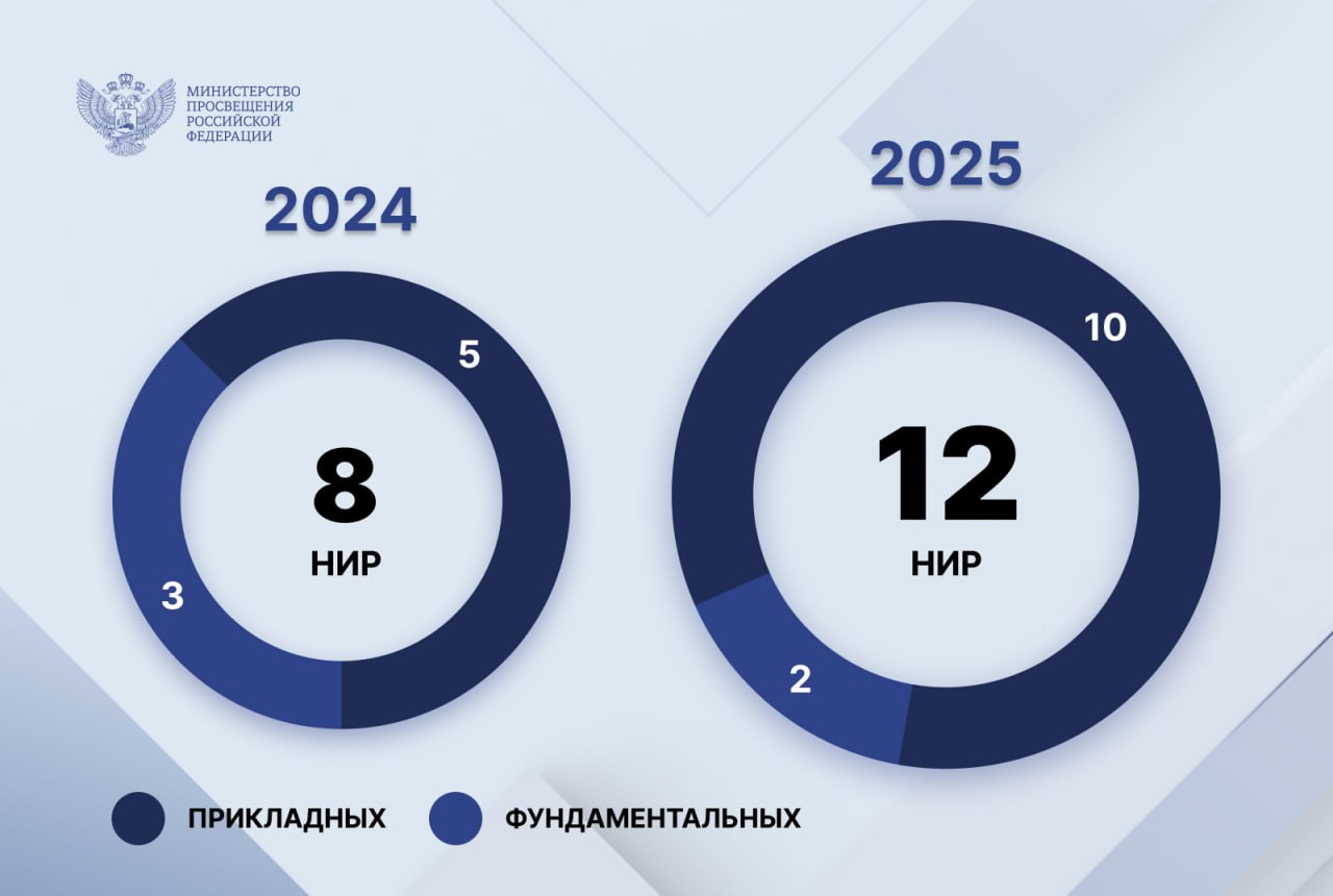 В 2025 году по заказу департаментов Минпросвещения России в вузе запланировано к реализации 12 НИР, из них десять относятся к прикладным, две – к фундаментальным.